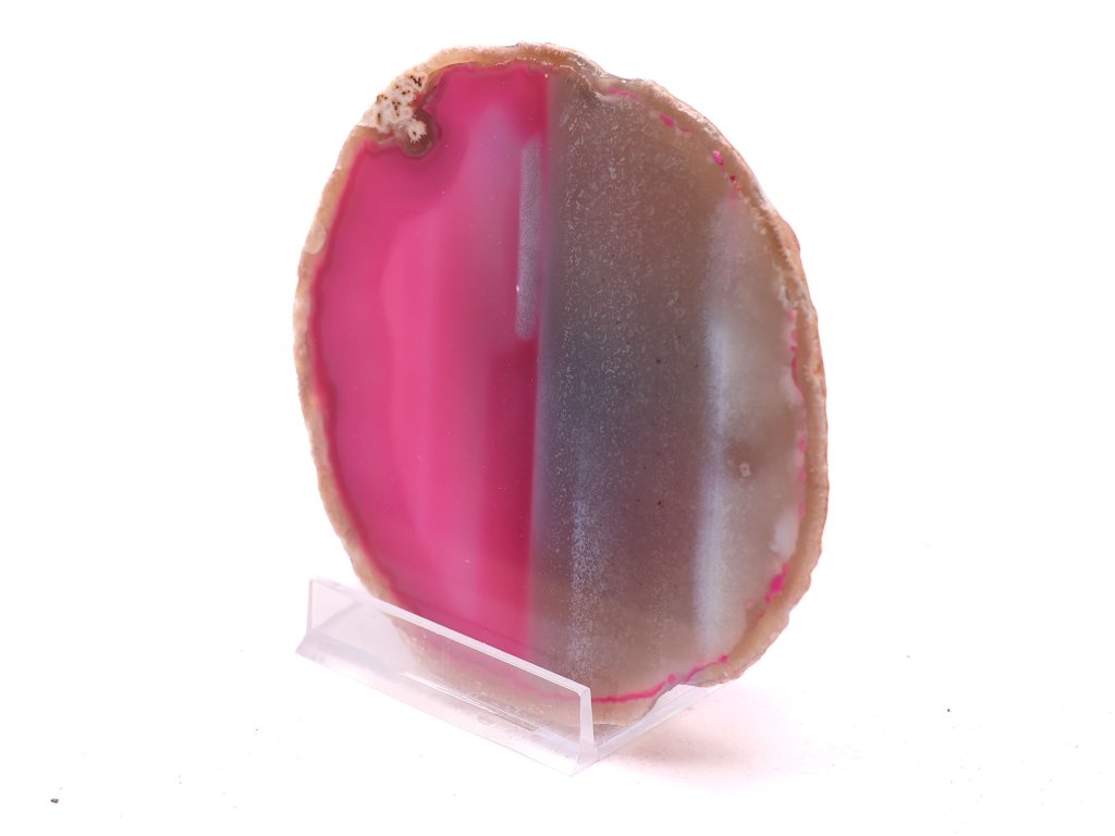 Tento elegantní plátek růžového achátu zaujme svým jemným barevným přechodem od sytě růžové po mléčně hnědý tón. Jeho barvy působí jako něžné spojení ženskosti a síly, přičemž hladký lesklý povrch zvýrazňuje přirozenou krásu kamene. Na světle se růžové odstíny rozzáří a dodávají kameni hřejivý, optimistický vzhled.