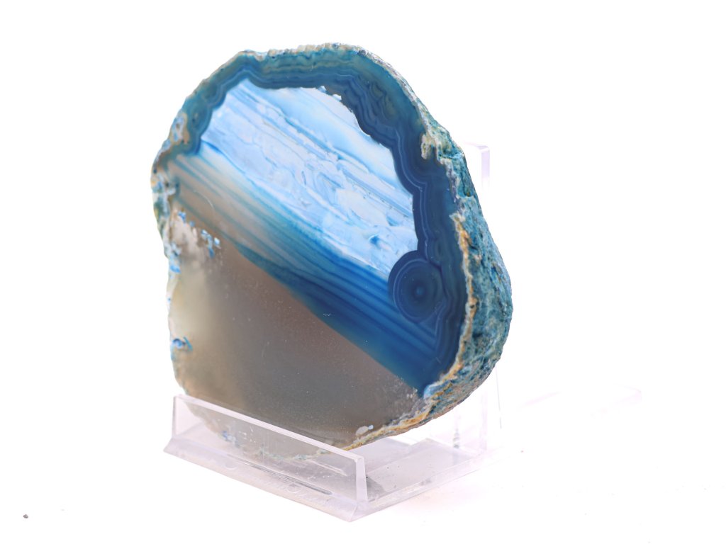Tento úchvatný plátek modrého achátu připomíná klidné mořské pobřeží zachycené v kameni. Jeho jemné přechody modré a béžové barvy vytvářejí harmonickou hru tónů, která působí uklidňujícím dojmem. Střed kamene se třpytí krystalickou strukturou, zatímco okraje zdobí přirozené vrstvení typické pro achát.