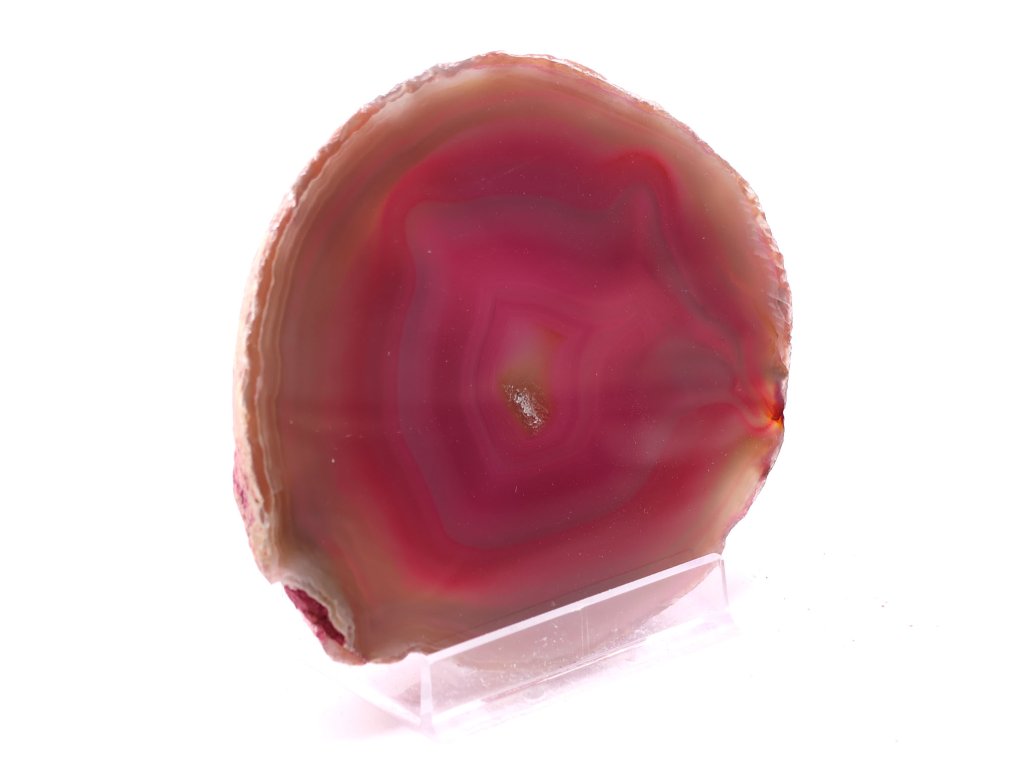 Tento výrazný plátek malinového achátu okouzlí svým sytým zbarvením a jemnými přechody mezi odstíny růžové, vínové a teplé hnědavé. Uprostřed kamene září drobný krystalický útvar, který připomíná skrytý poklad přírody. Hladký lesklý povrch a přirozené kruhové linie vytvářejí fascinující hru světla a hloubky.