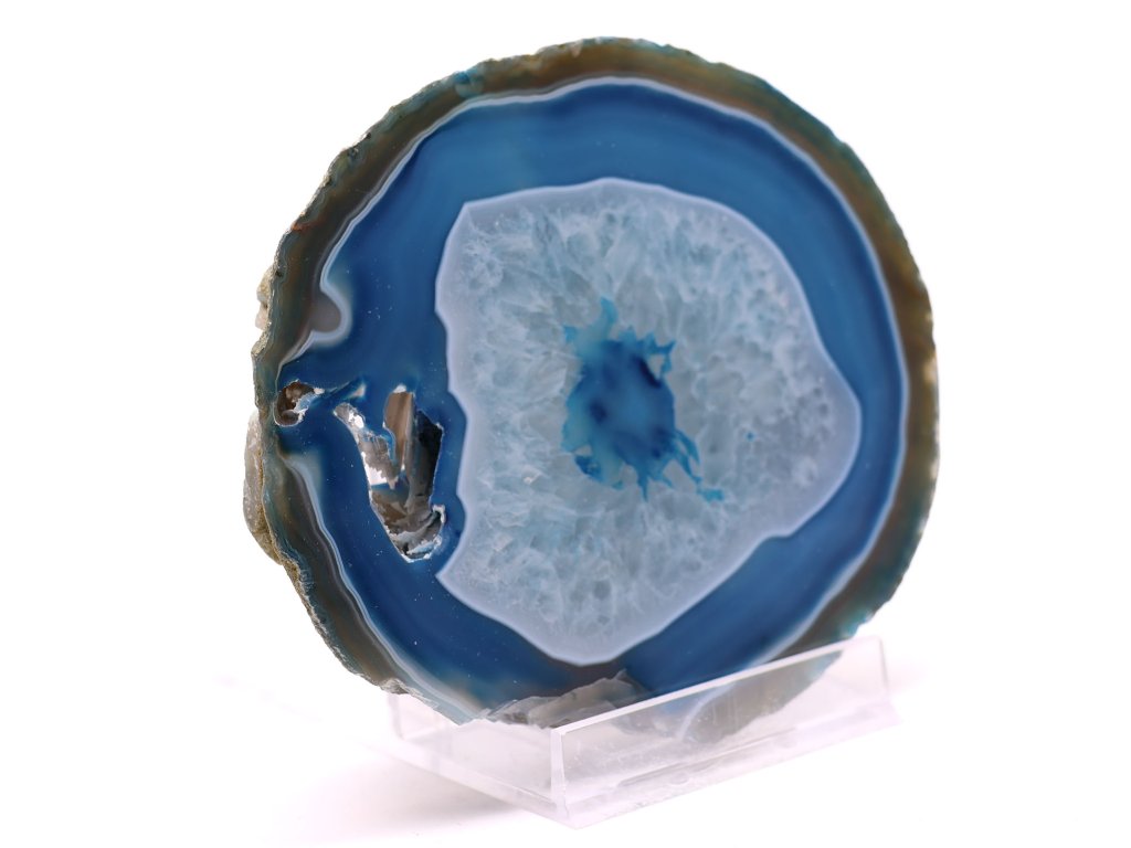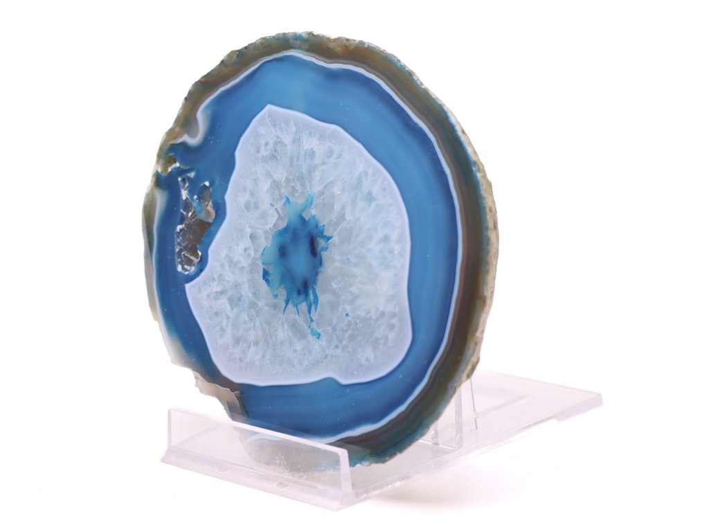 Tento dechberoucí plátek modrého achátu zaujme svým fascinujícím středem, který připomíná krystalické srdce obklopené vlnami oceánských odstínů. Kombinace světle modrých a tmavších vrstev vytváří harmonii mezi jemností a hloubkou, zatímco přirozené dutinky a nerovnosti na okraji dodávají kameni autentický vzhled.
