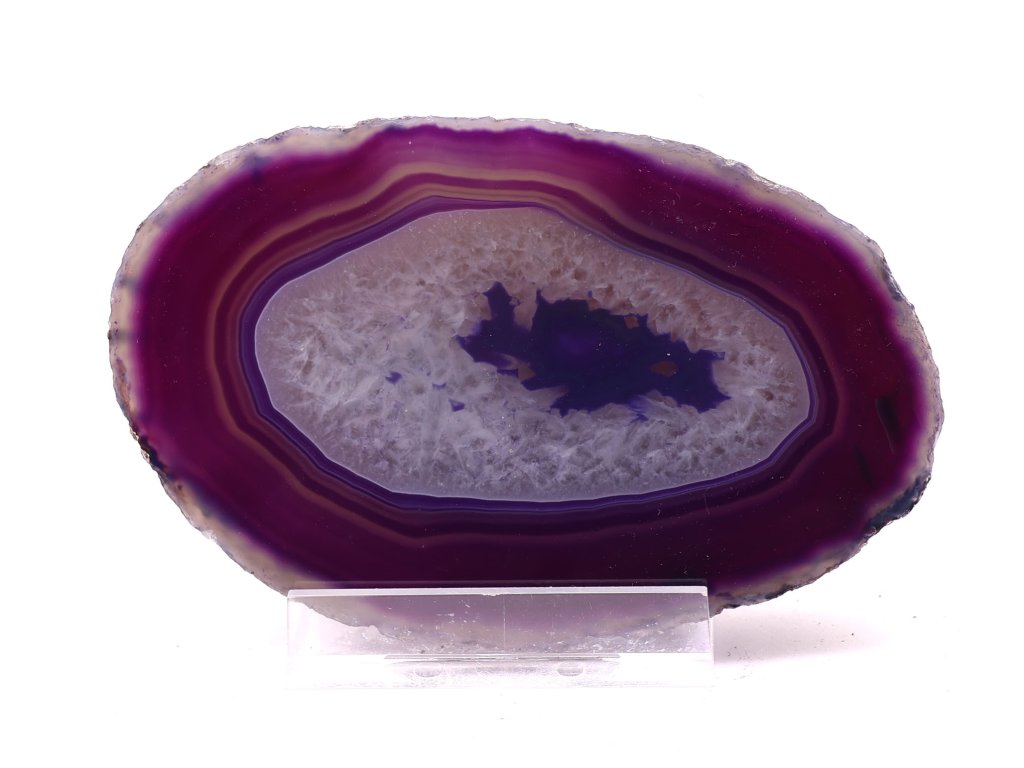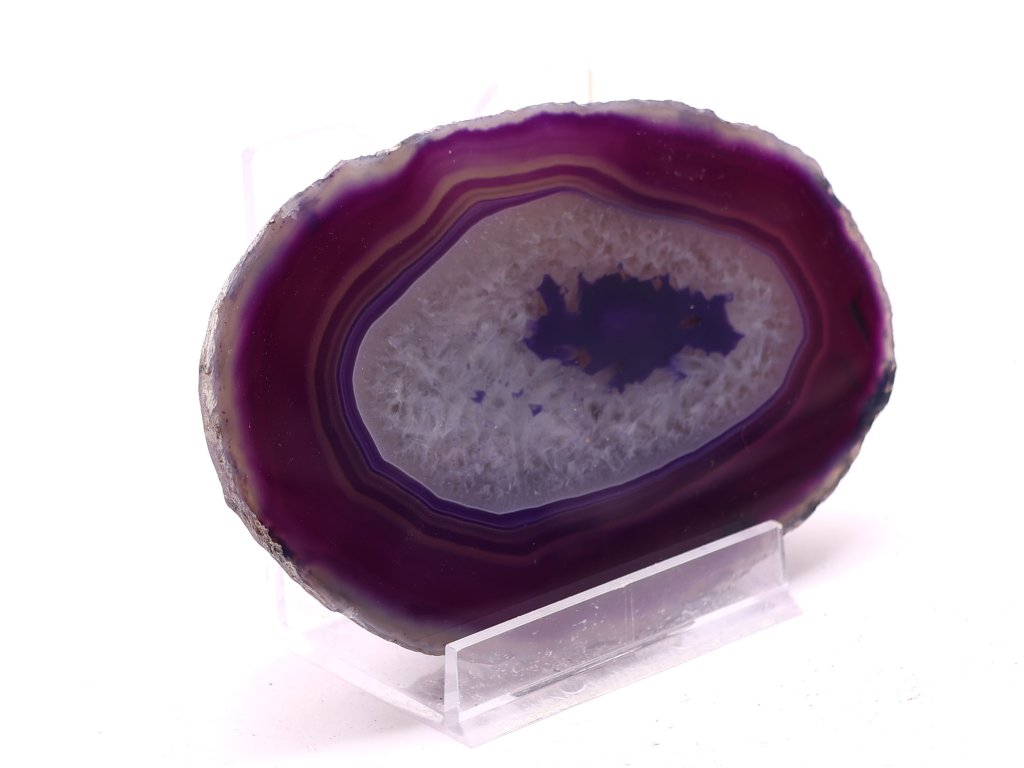 Tento úchvatný plátek fialového achátu zaujme svou dokonalou harmonií barev a krystalickým středem, který působí jako pohled do nitra Země. Kontrast mezi sytě fialovými okraji a jemně bílým, jiskřivým centrem vytváří efekt hloubky a elegance. Každý pruh v kameni je jedinečný a vypráví příběh pomalého růstu minerálu v přírodě.