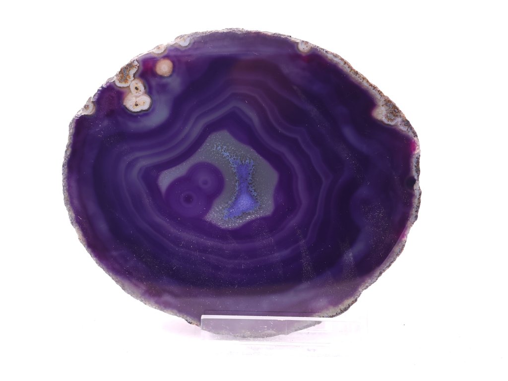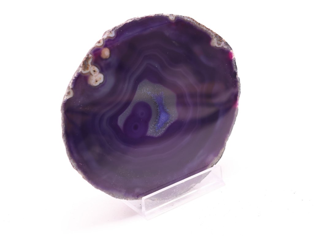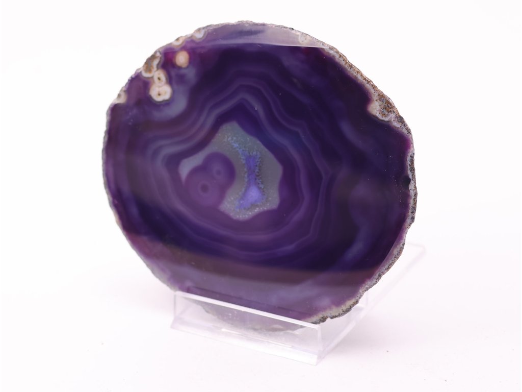 Tento jedinečný plátek fialového achátu zaujme svým intenzivním odstínem a dokonalou strukturou vrstev. Temné fialové tóny přecházejí do světlejších odstínů levandule a vytvářejí fascinující soustředné linie, které vedou pohled ke krystalickému středu kamene. Jeho přirozený lesk a tvar působí jako umělecké dílo samotné přírody.