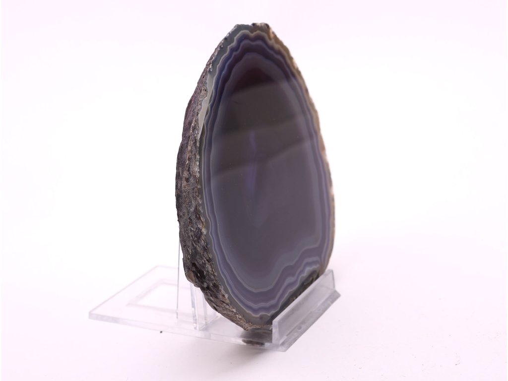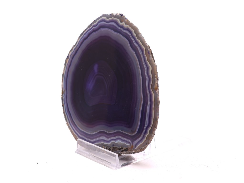 Tento nádherný plátek fialového achátu zaujme na první pohled svou hloubkou a intenzitou barev. Tmavě fialové jádro se postupně rozjasňuje do světlejších tónů, které vytvářejí přirozené kruhové vrstvy typické pro tento minerál. Každý detail působí dojmem tajemné elegance a klidu, jako by v sobě kámen ukrýval kousek noční oblohy.