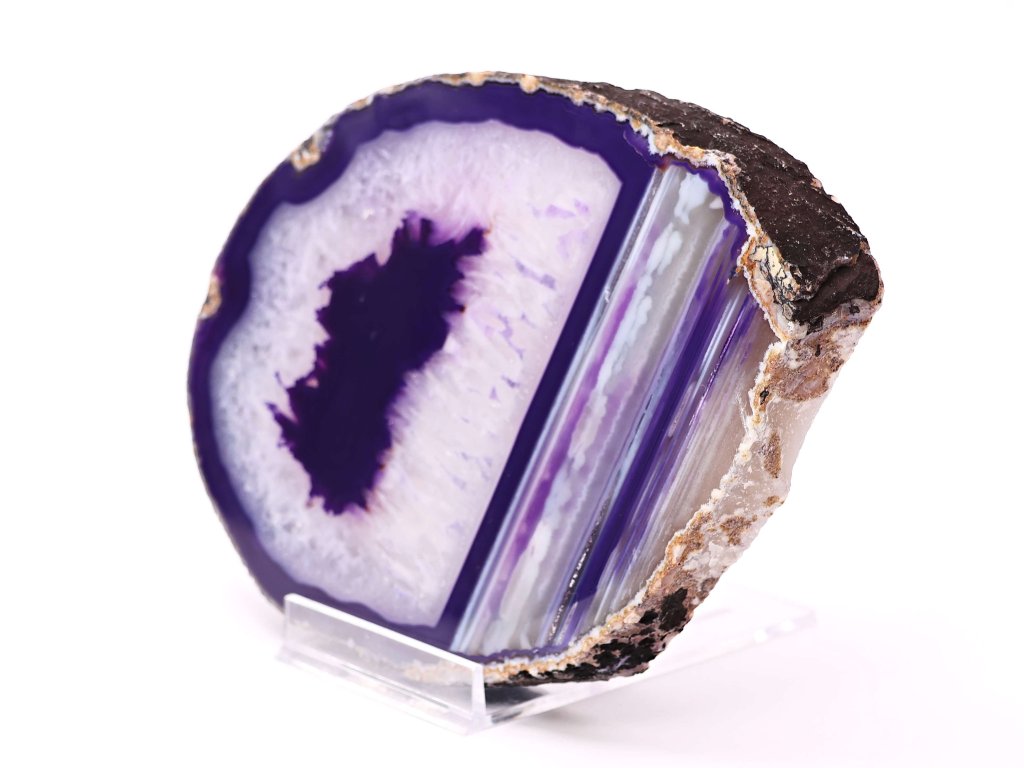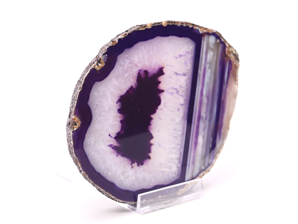 Nechte se okouzlit jedinečnou krásou tohoto velkého plátku barveného achátu. Kámen na první pohled zaujme svou sytě fialovou barvou, která plynule přechází od tmavých okrajů až po třpytivý krystalický střed. Výrazná kresba s typickým pruhováním na jedné straně a jemnou krystalizací na straně druhé z něj činí nepřehlédnutelný designový prvek.