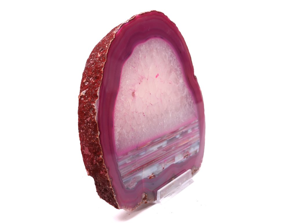 Tento elegantní plátek růžovo-fialového achátu zaujme svými jemnými tóny, které působí harmonicky a dodávají prostoru nádech klidu i luxusu. Barvy přecházejí od syté fuchsiové po světle růžovou a vytvářejí dojem uklidňujícího západu slunce ukrytého v kameni. Jemná kresba a hladký povrch na jedné straně kontrastují s přirozenou strukturou krystalů na straně druhé, díky čemuž je každý kus naprostý originál.