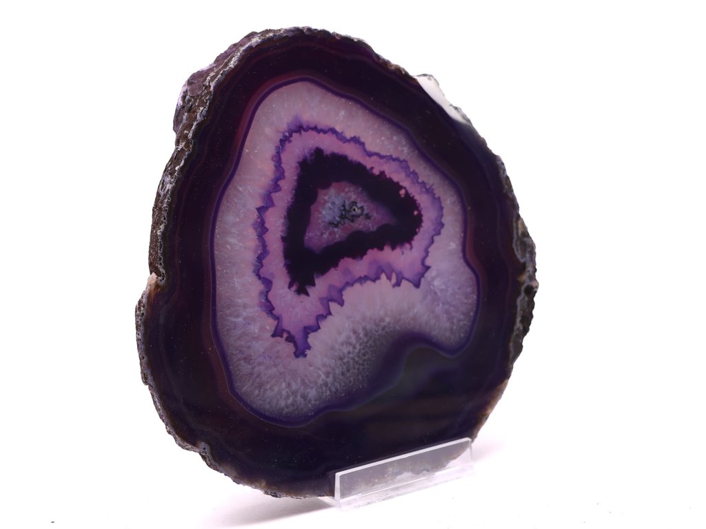 Tento jedinečný plátek fialového achátu zaujme svou výraznou kresbou a hlubokým odstínem. Vrstvy tmavě fialové se harmonicky střídají se světlejšími tóny levandule, které se sbíhají do fascinujícího středu připomínajícího krystalické srdce. Ostré kontury a jemné krystalky v jádru kamene vytvářejí efekt hloubky a přirozené elegance.