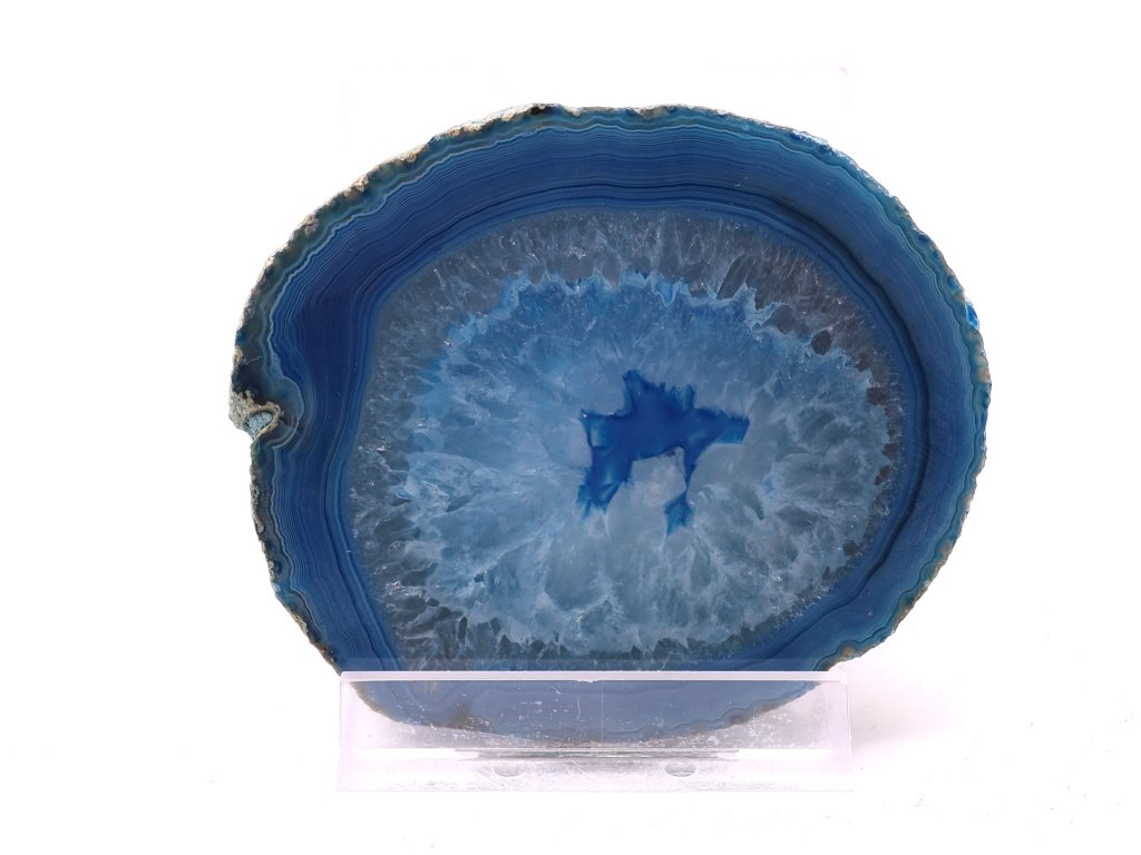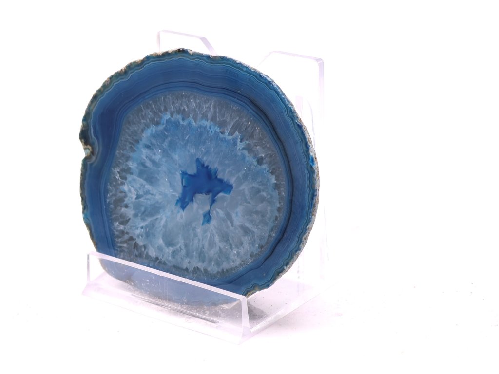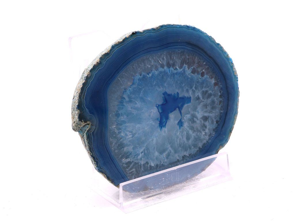 Tento nádherný plátek modrého achátu uchvátí svou ledově čistou krásou. Jeho křišťálově modré jádro přechází do temnějších pruhů po okrajích, čímž vytváří efekt hloubky a klidu, jako byste se dívali do nitra oceánu. Krystalická struktura ve středu kamene září jako zamrzlá hvězda a dodává mu jedinečný charakter.