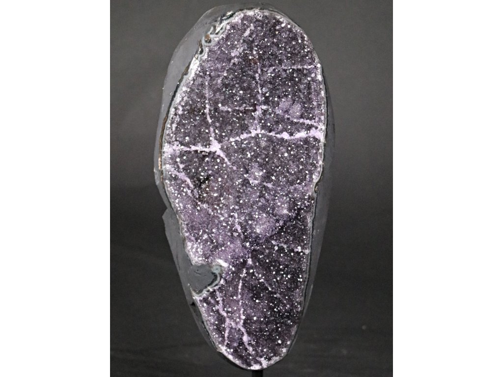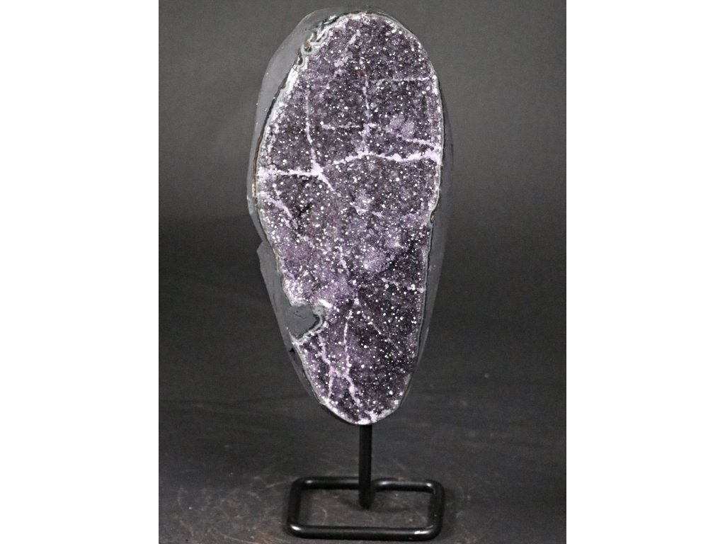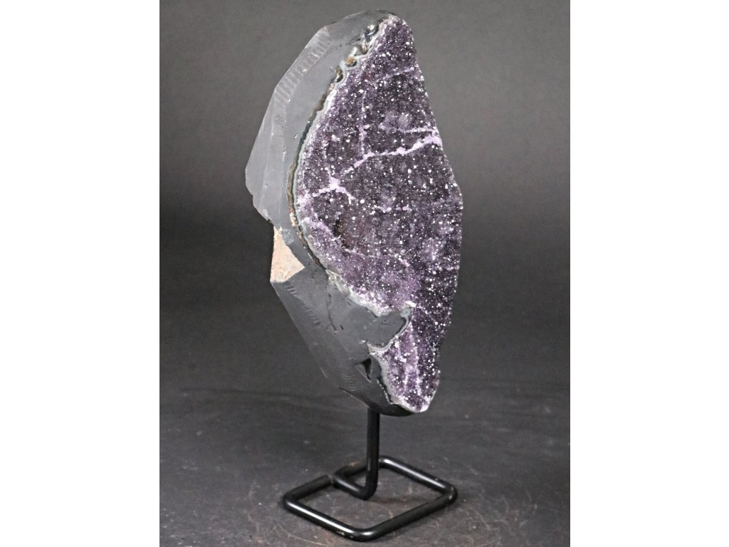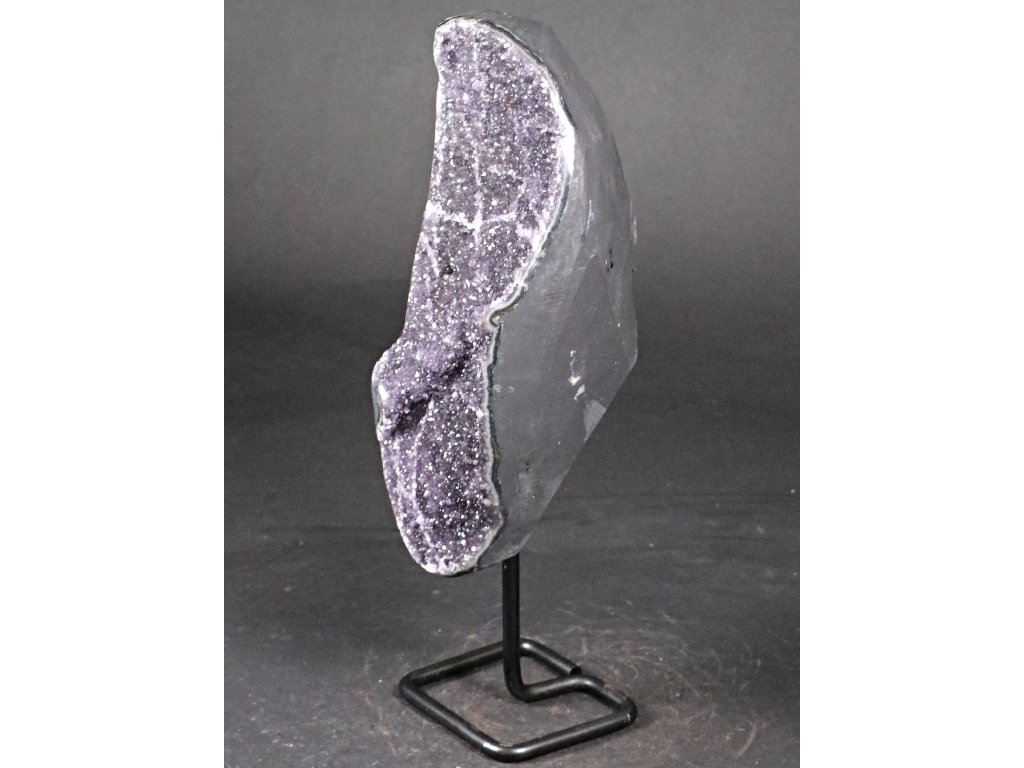 Ametystová drúza vysoké kvality s krystaly fialové barvy na kovovém stojánku