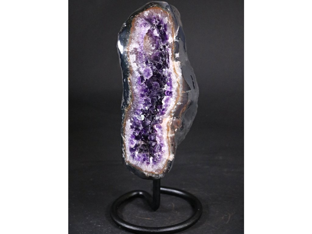 Ametystová drúza vysoké kvality s krystaly fialové barvy na kovovém stojánku