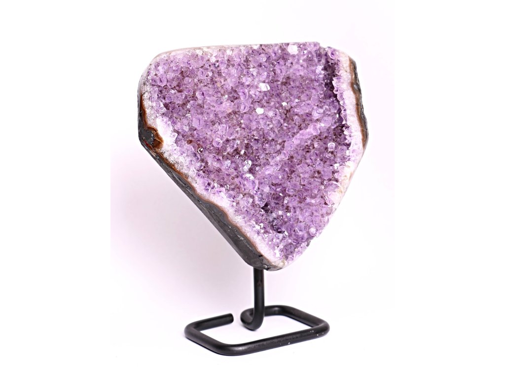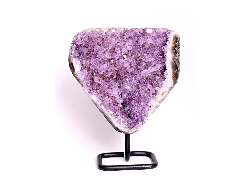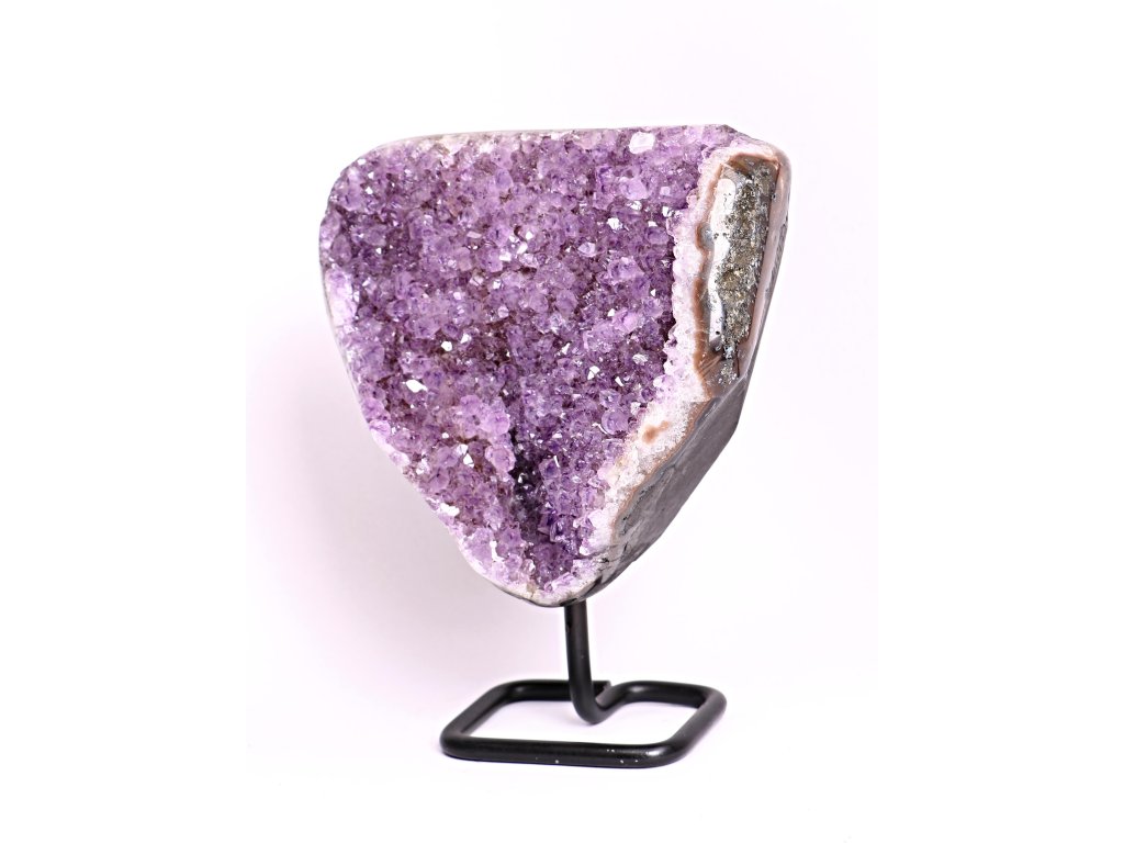 Ametystová drúza vysoké kvality s krystaly fialové barvy na kovovém stojánku