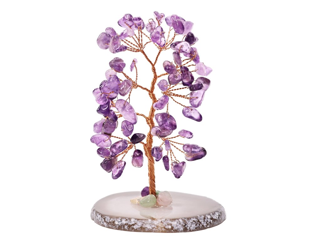 Krásný stromeček štěstí z přírodního ametystu symbolizuje klid, duchovní rovnováhu a očistu mysli. Každý list je tvořen drobným tromlovaným kamínkem ametystu, který je pečlivě upevněn na měděném drátku a vytváří tak harmonický celek s jemnou energií.