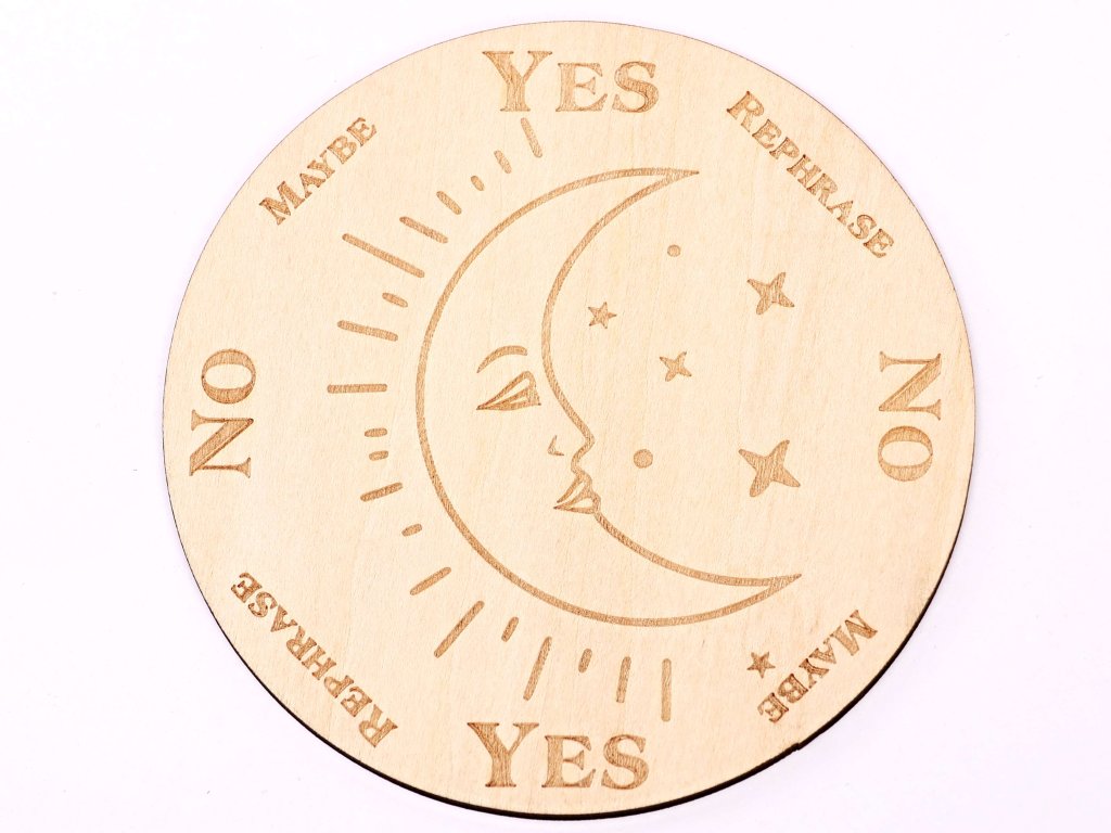Stylová dřevěná podložka s jemným gravírováním půlměsíce a hvězd je ideální pomůckou pro každého, kdo pracuje s kyvadlem nebo se zajímá o věštění. Kruhový tvar symbolizuje celistvost a jednotu, zatímco měsíc zastupuje intuici, ženskou energii a vnitřní vedení.