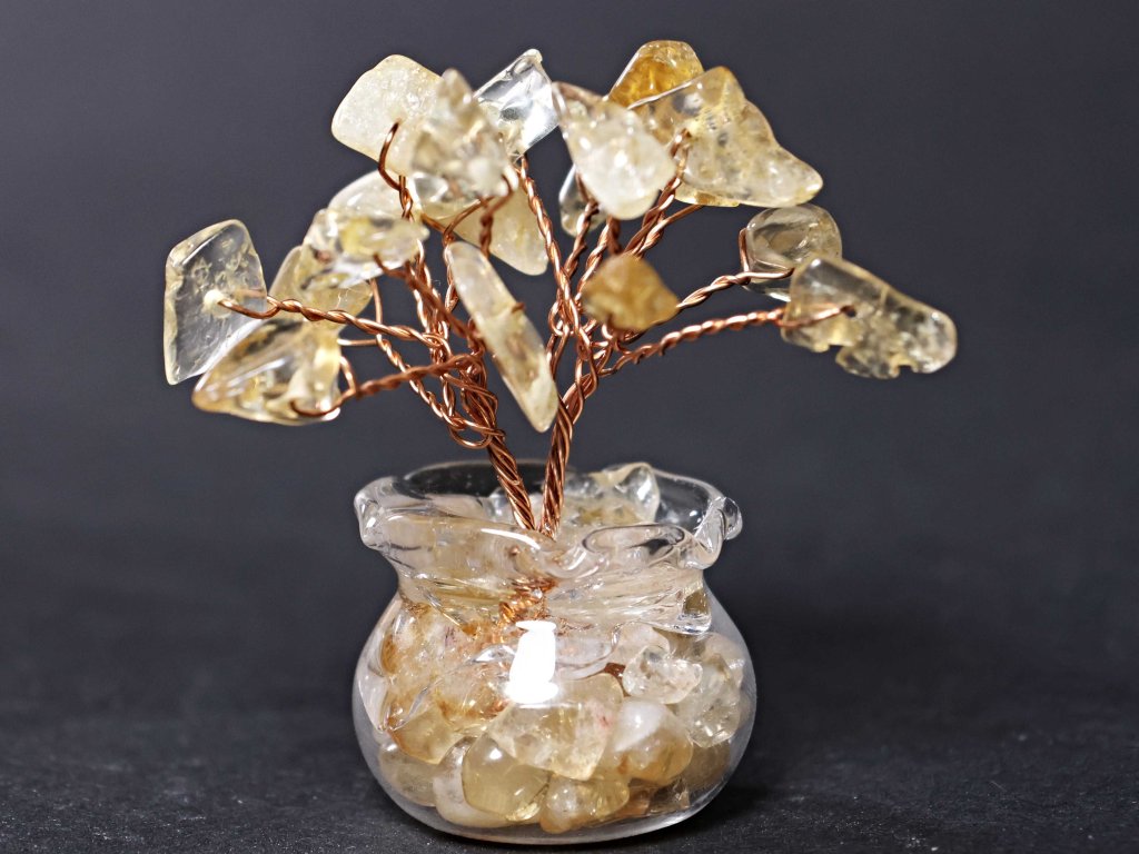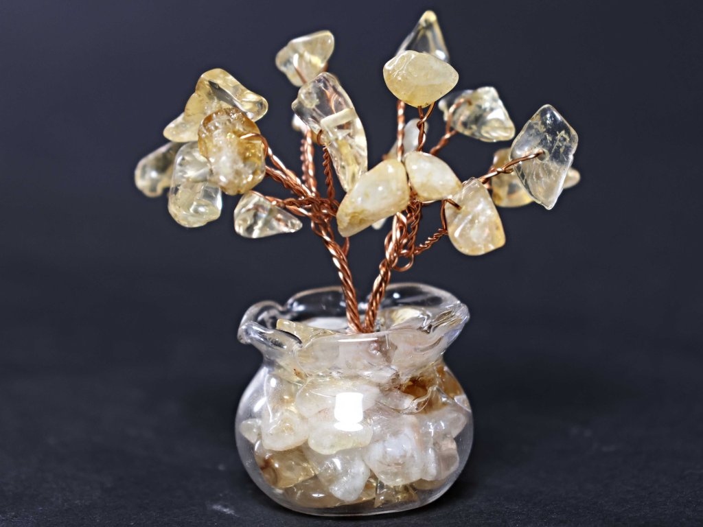 Tento jemný stromeček štěstí je vyroben z tromlovaných kamenů citrínu, které jsou uchyceny na kroucených drátcích tvarovaných do podoby větviček. Umístěn je do dekorativní skleněné vázičky, jež je plněna dalším citrínem – výsledkem je dokonale sladěný a zářivý celek.