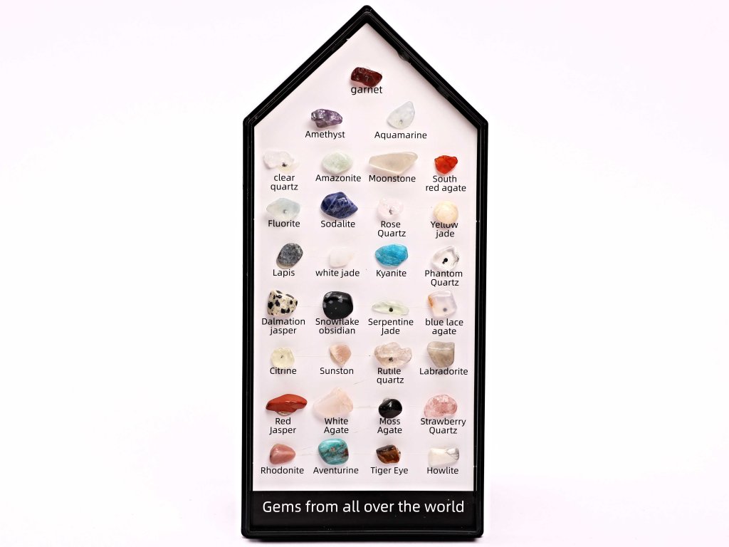 Objevte rozmanitost přírodních kamenů s touto elegantní sbírkou 24 minerálů z celého světa, uložených v originálním boxu ve tvaru domečku. Každý kámen je pečlivě vybrán, vyleštěn a doplněn názvem, aby byla sbírka nejen estetická, ale i vzdělávací.