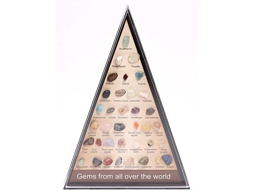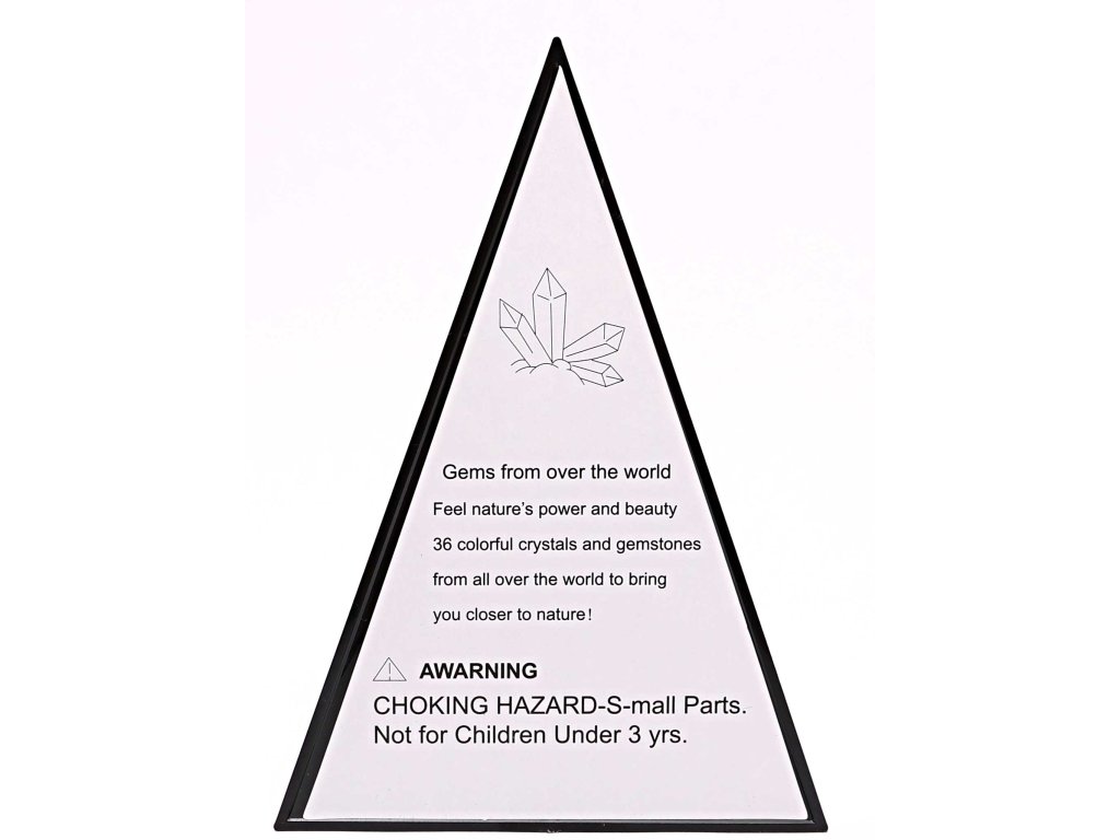 Elegantní trojúhelníkový box ukrývá pestrou sbírku 36 přírodních minerálů z celého světa. Každý kamínek je označen názvem a pečlivě uložen, takže sbírka slouží nejen jako krásná dekorace, ale i jako vzdělávací pomůcka. Díky svému tvaru a průhlednému krytu je navíc ideálním dárkem pro děti i dospělé milovníky geologie a přírody.