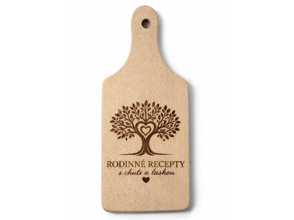 Prkénko je vyrobeno z kvalitního bukového dřeva a zdobí ho detailní laserem gravírovaný motiv stromu s nápisem „Rodinné recepty s chutí a láskou“. Hodí se nejen jako kuchyňské prkénko, ale také jako dekorativní prvek nebo milý dárek pro vaše blízké.