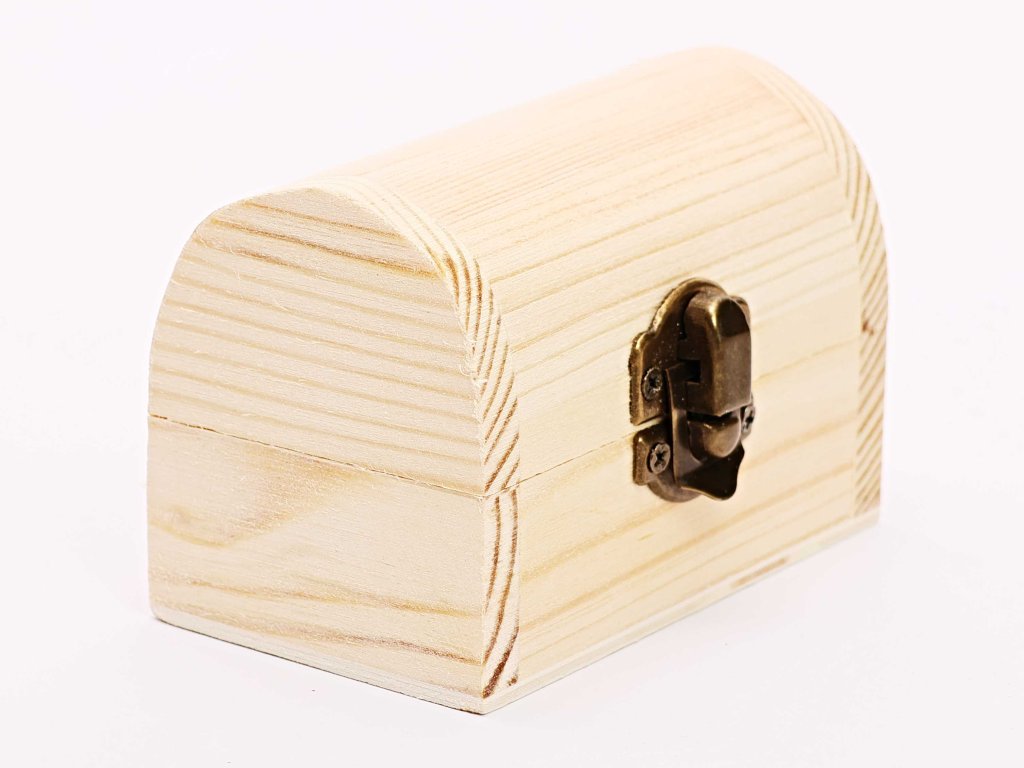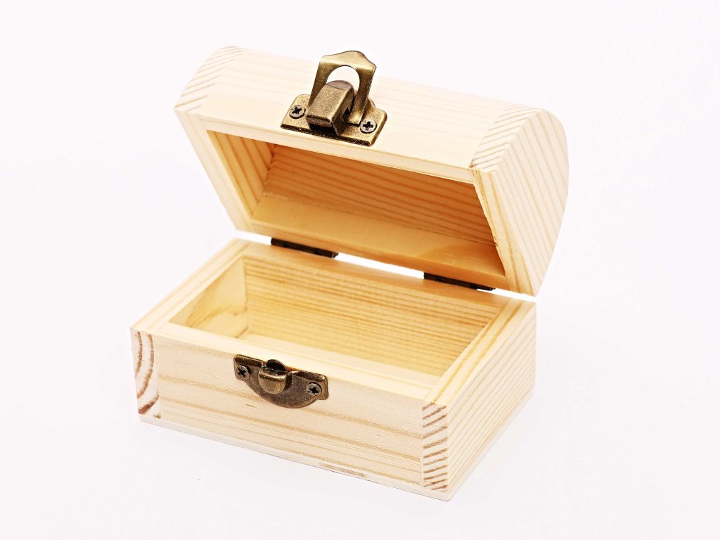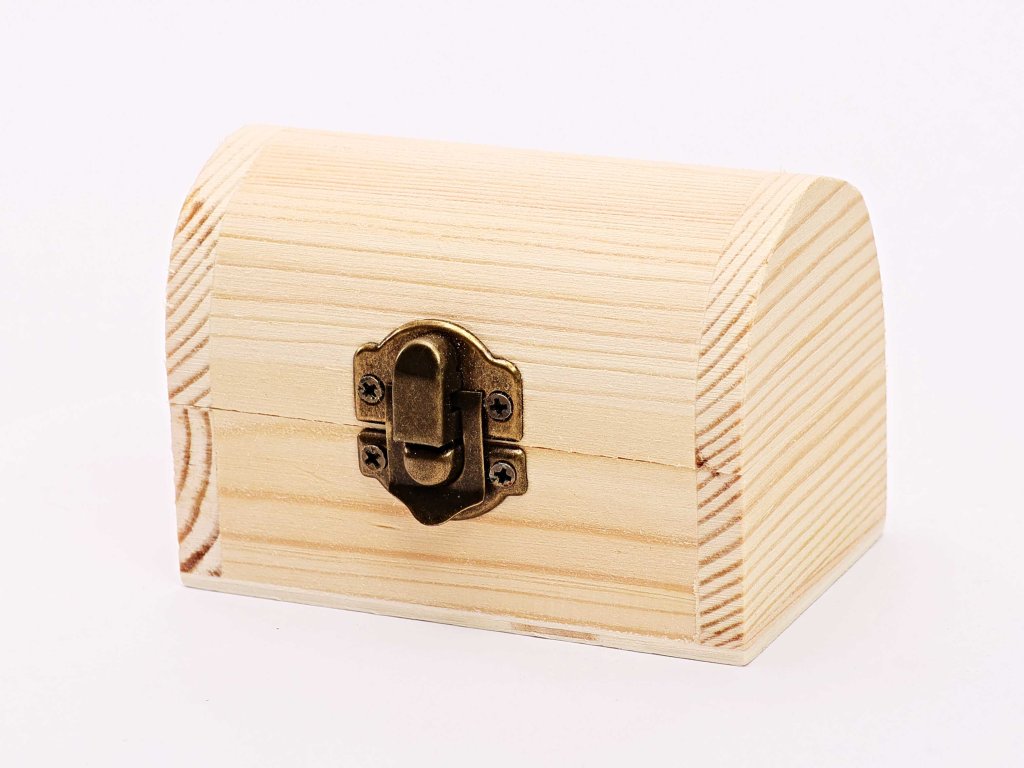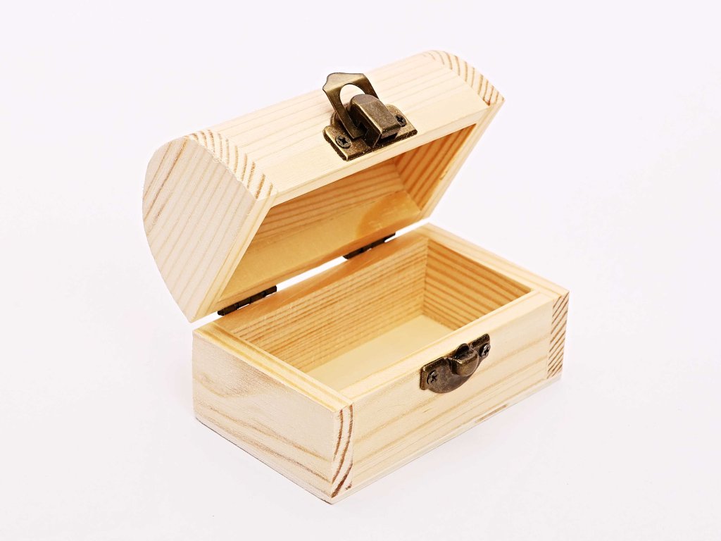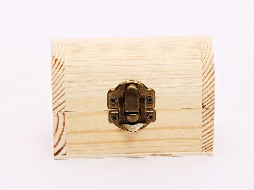 Tato elegantní dřevěná truhlička s kovovým zapínáním je ideální pro ukládání minerálů, drahých kamenů, šperků nebo jiných drobných pokladů. Je vyrobena z přírodního dřeva a není lakovaná, takže si ji můžete dozdobit dle vlastní fantazie – barvami, mořidly, laky či technikou decoupage.