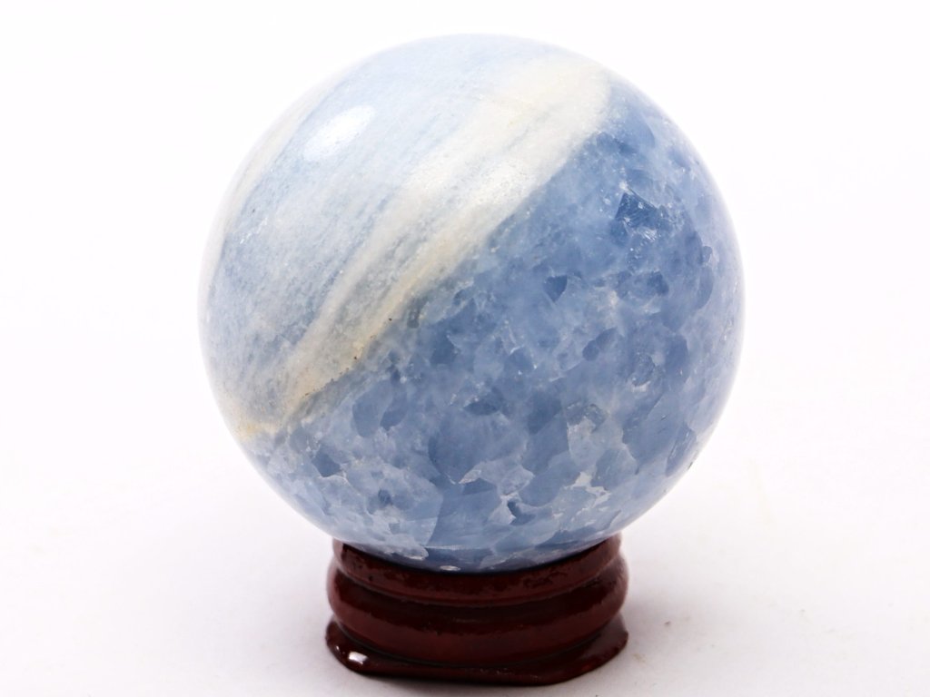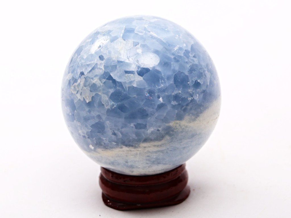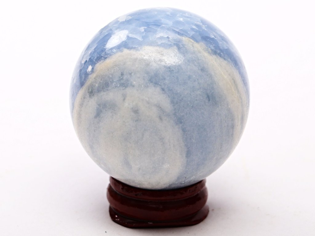 Kalcit modrý koule 55 mm 212 g přírodní kámen + dřevěný podstavec #K1026