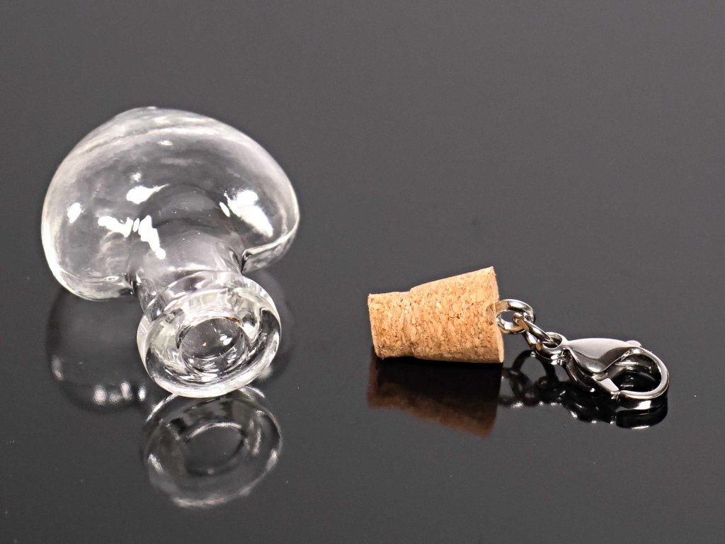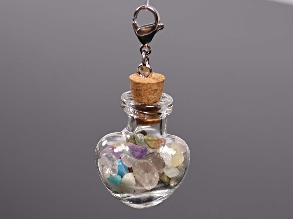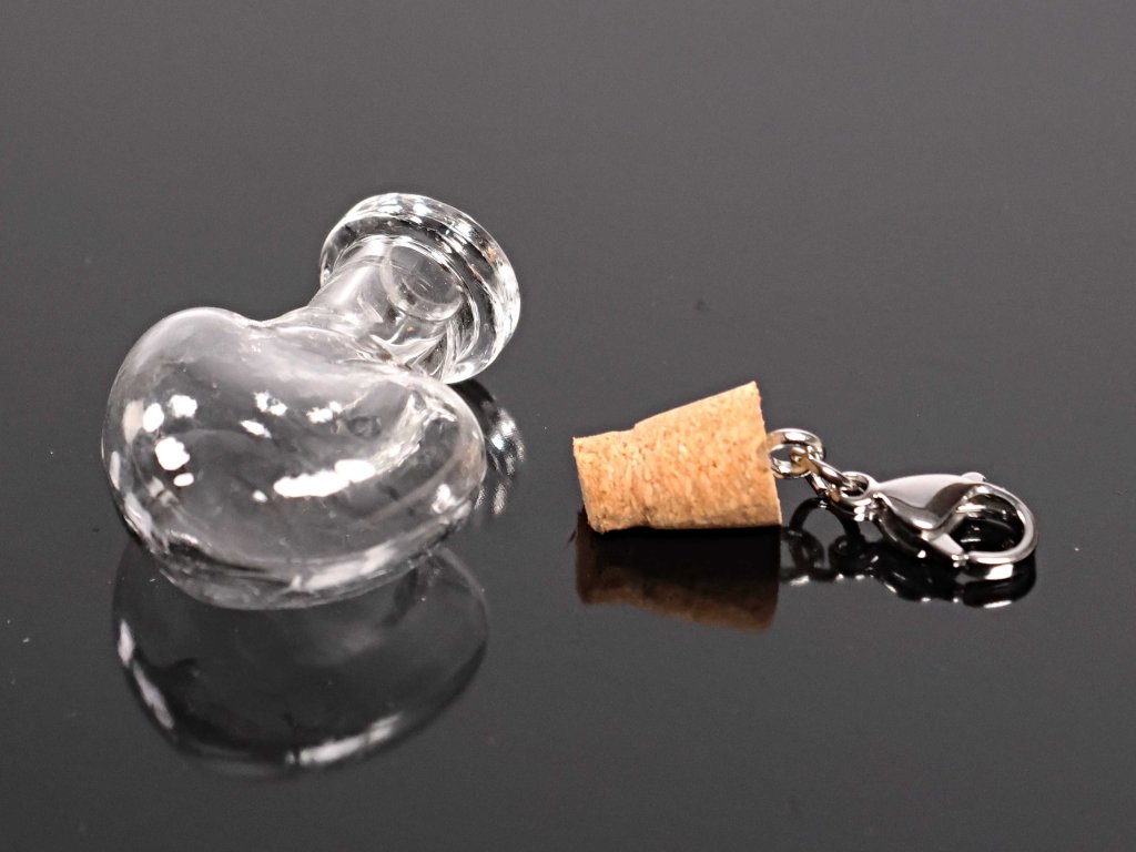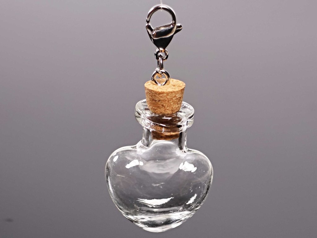 Elegantní skleněná lahvička ve tvaru srdce s kovovou karabinkou je ideální jako přívěsek, talisman nebo dekorace. Uzavírá se přírodním korkovým špuntem a díky hrdlu o průměru cca 5 mm je vhodná pro naplnění drobnými kamínky, bylinkami nebo třpytkami.