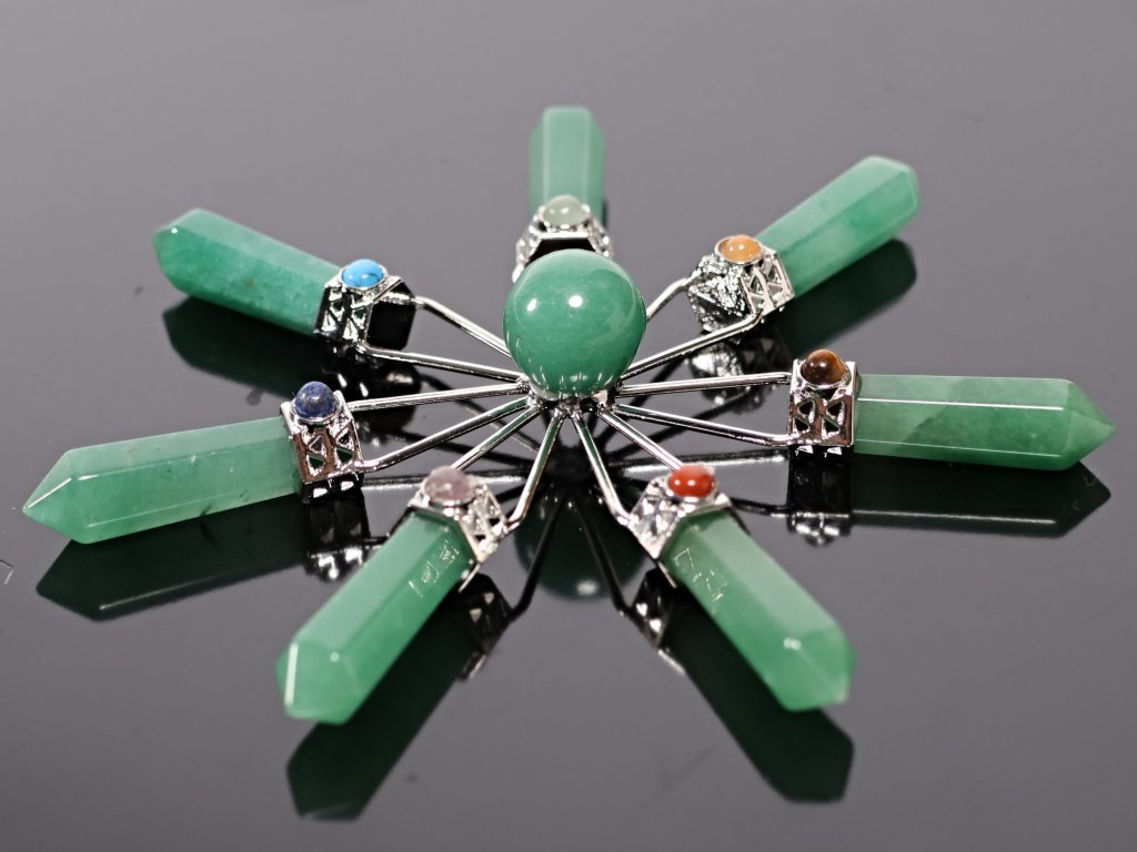 Harmonický krystalový generátor z přírodního zeleného avanturínu, navržený pro zesílení, vyrovnání a plynulé rozvádění energie. Ve středu se nachází leštěná avanturínová koule, z níž symetricky vychází sedm broušených špic. Každá špice je zakončena čakrovým kamenem, který odpovídá jedné z hlavních čaker a podporuje celkovou energetickou rovnováhu.