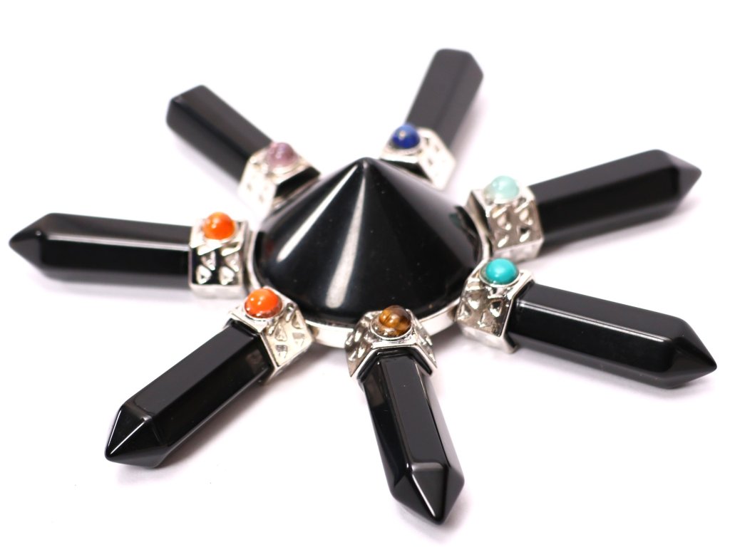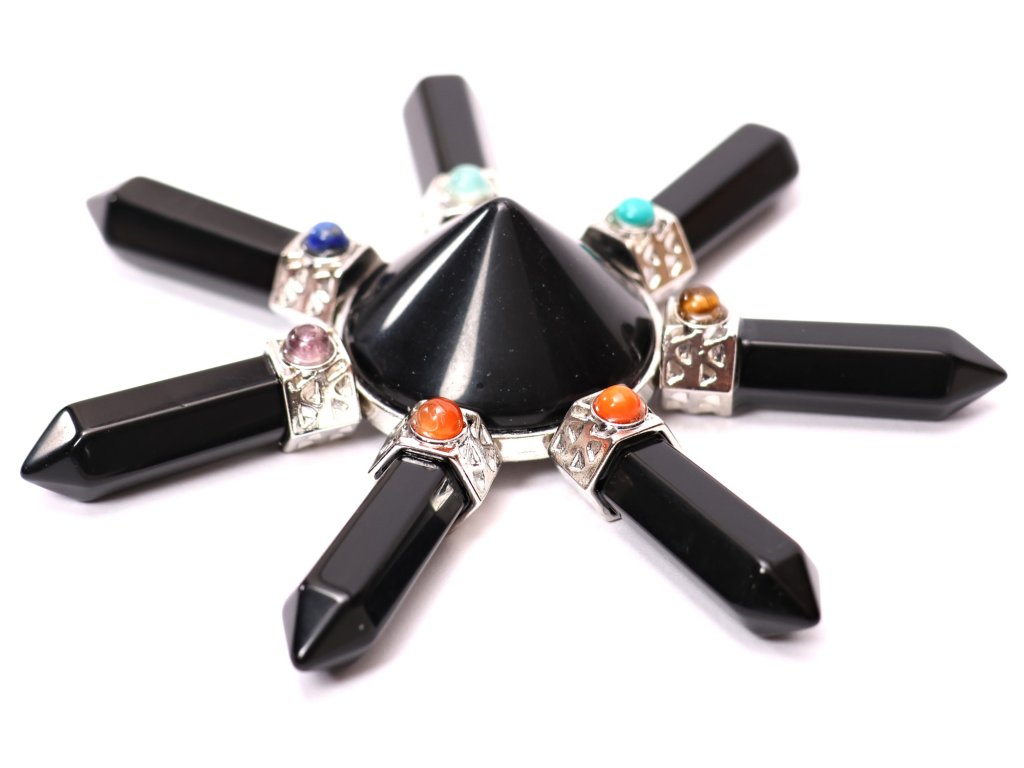 Tento výrazný krystalový generátor je vytvořen z přírodního obsidiánu, který je silně ochranným kamenem, tradičně spojovaným s odstraňováním negativity, duchovní očistou a uzemněním. Uprostřed se nachází masivní obsidiánový kámen, z jehož středu vychází sedm broušených krystalových hrotů, které rozvádějí energii harmonicky do všech směrů.