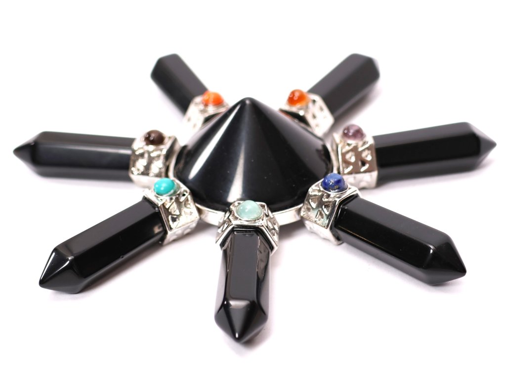 ✨ Krystalový generátor se 7 špicemi – Obsidián + chakra kameny ✨
