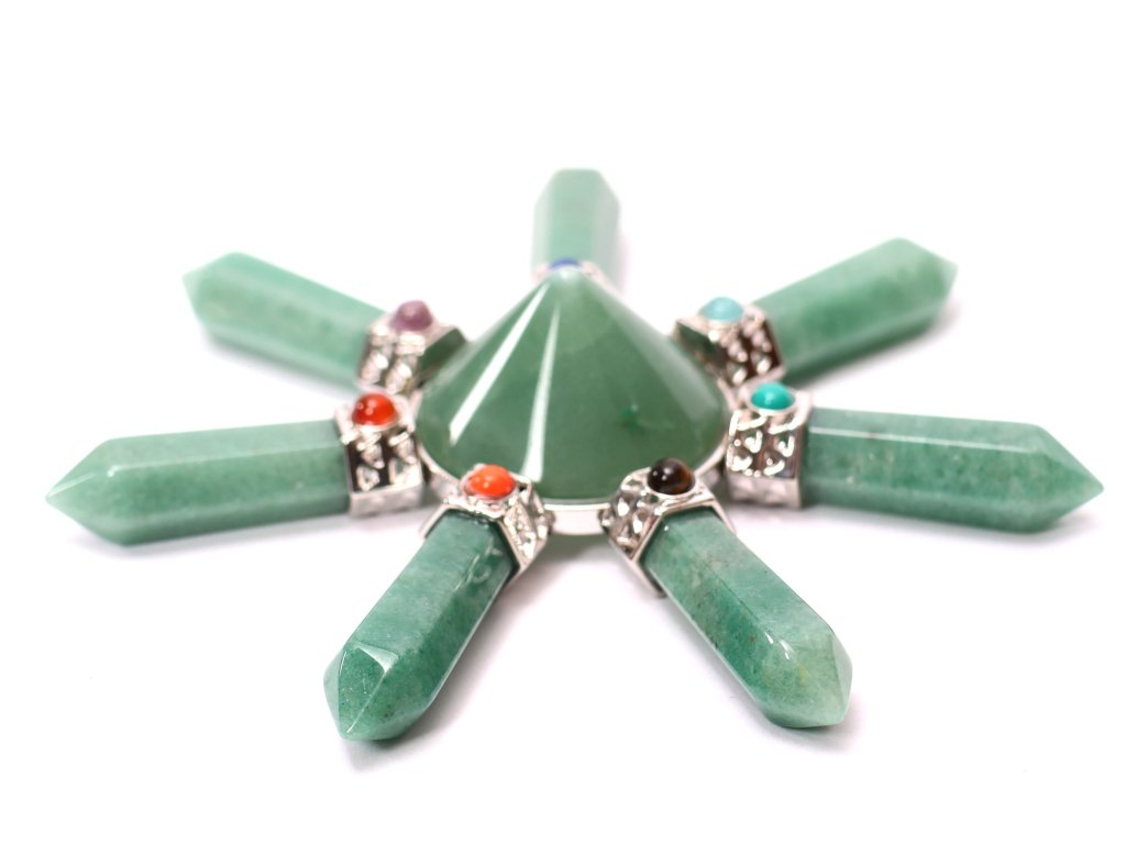 Tento nádherný krystalový generátor je vyroben ze zeleného avanturínu, kamene harmonie, štěstí, obnovy a pozitivní energie. Uprostřed se nachází dominantní avanturínový kámen, z jehož středu vychází sedm broušených krystalových hrotů, které jemně rozvádějí energii do prostoru i směrem k tělu.