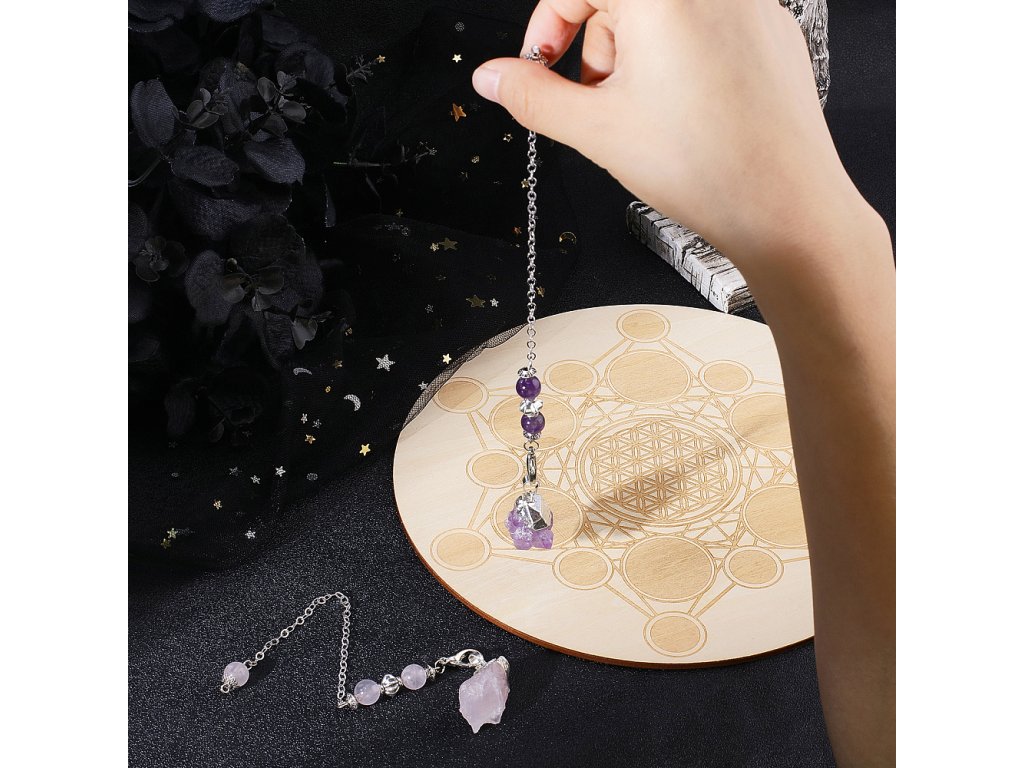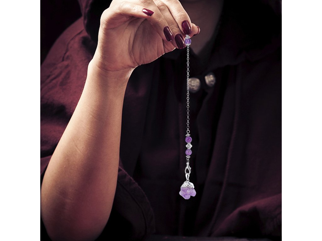 Toto elegantní kyvadlo z přírodního ametystu je výjimečnou pomůckou pro práci s intuicí, duchovním vhledem a ochranou energií. Surový ametystový hrot si zachovává svou přirozenou strukturu a sílu, zatímco ozdobný řetízek s ametystovými korálky dodává celému kyvadlu mystický a harmonický vzhled.