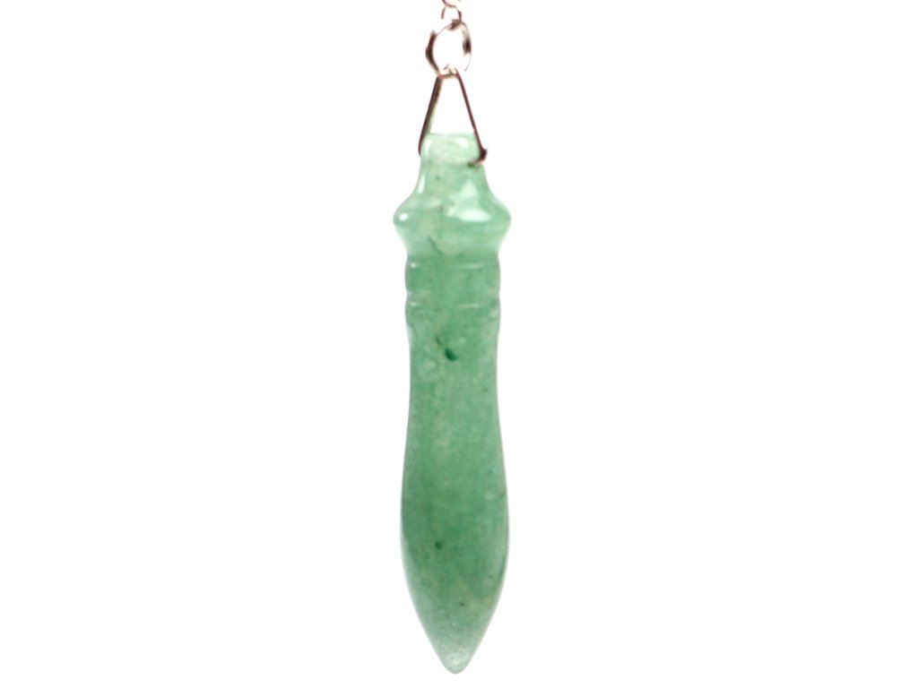Toto stylové kyvadlo z přírodního zeleného avanturínu je ideálním nástrojem pro věštění, práci s energií i meditaci. Kámen je ručně broušen do protáhlého, ergonomického tvaru se zaoblenou špičkou a ozdobným členěním ve vrchní části, které napomáhá přesnému vedení energie. Kyvadlo je zavěšeno na kovovém řetízku o celkové délce cca 23 cm, který je zakončen kuličkou z avanturínu pro snadné uchopení.