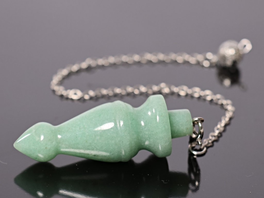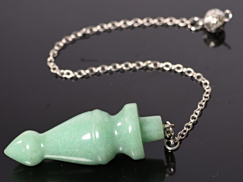 Elegantní kyvadlo z přírodního avanturínu je krásným nástrojem pro práci s energií, věštění i meditaci. Jemně zelený broušený kámen je zasazen do dekorativního kovového závěsu a upevněn na stříbrně zbarveném řetízku s ozdobnými detaily, které podtrhují jeho harmonický vzhled i energetickou sílu. Avanturín se vyznačuje svým typickým třpytem a zklidňující barvou, díky čemuž působí jemně a zároveň velmi podporujícím dojmem.
