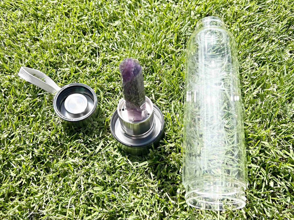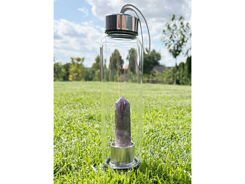 Uvnitř láhve je upevněn přírodní krystal ametystu, který lze snadno vyjmout a vyměnit.
