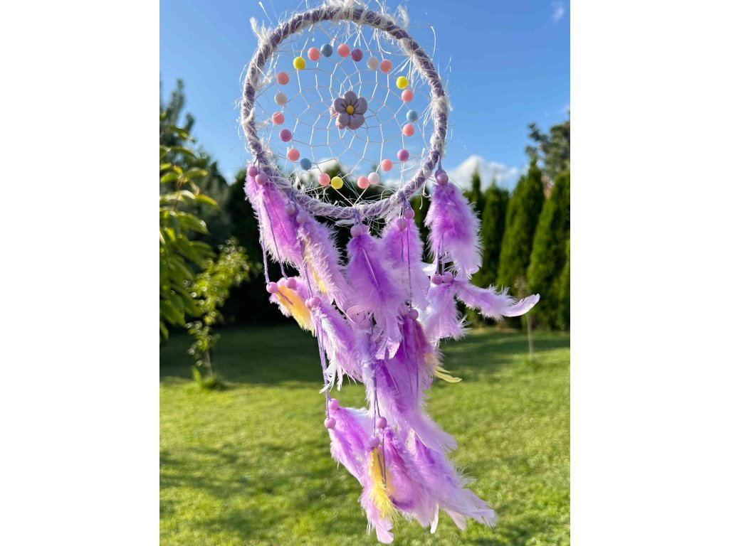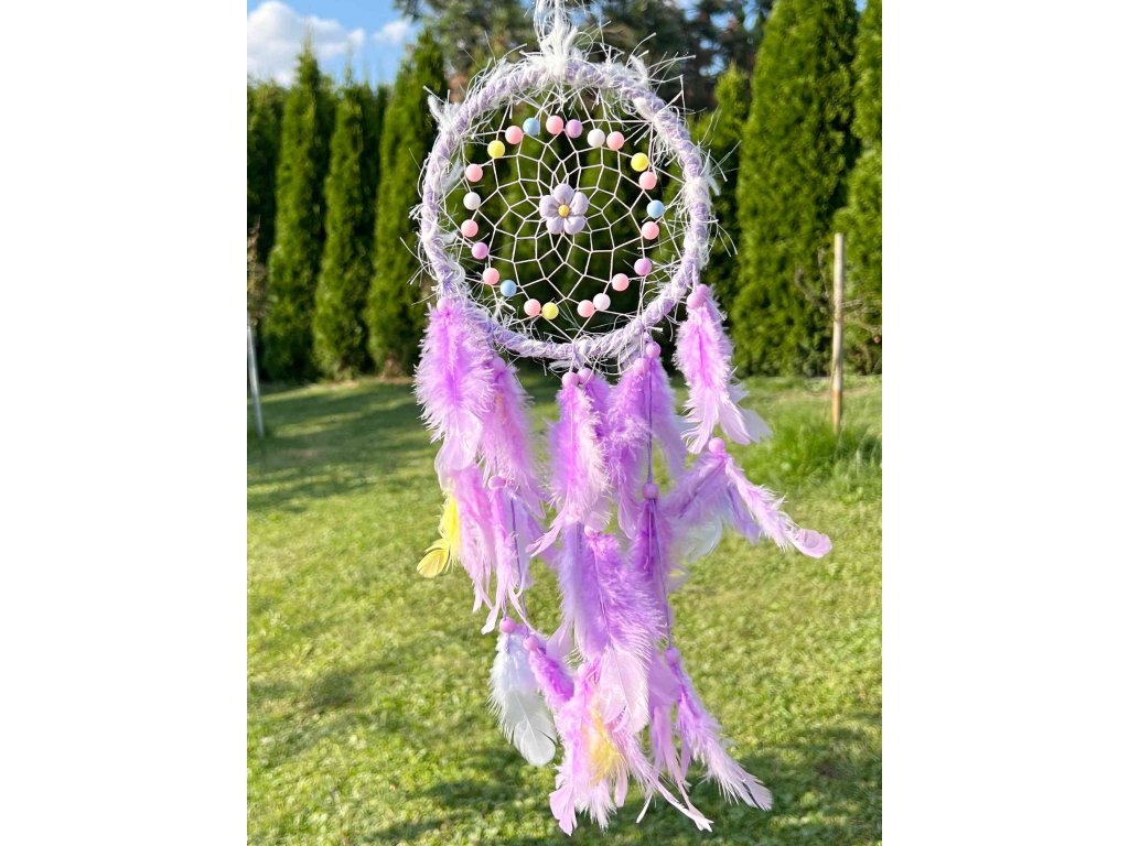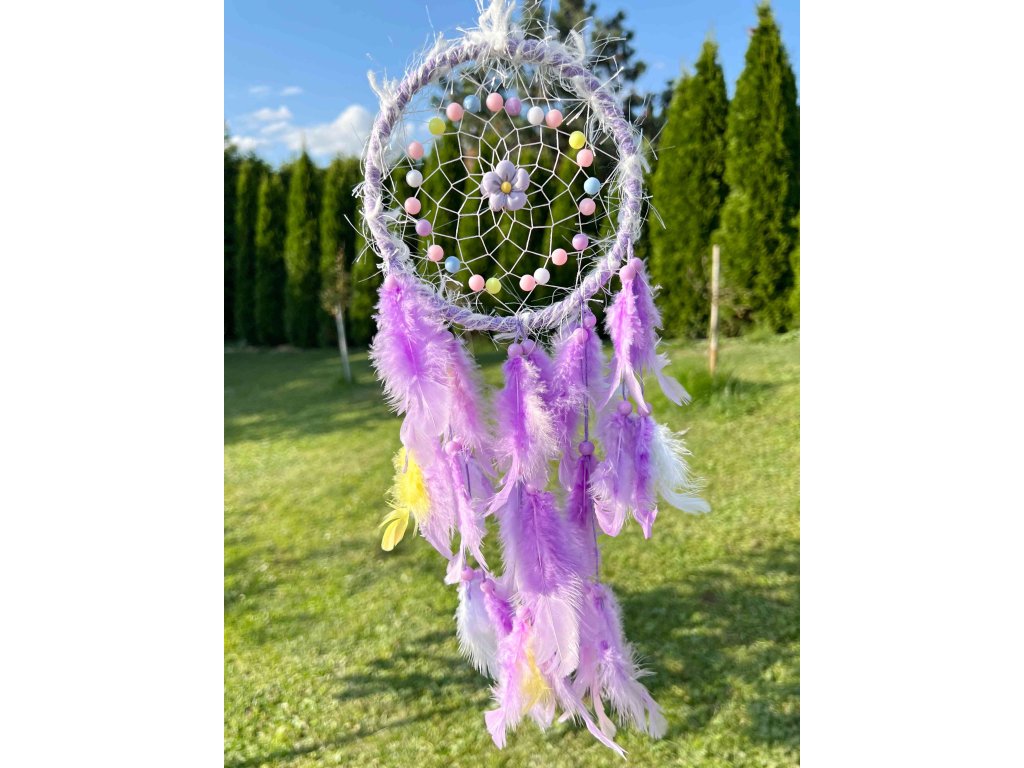 Tento jemný lapač snů v tónech fialové, růžové a žluté působí jako kousek jarní zahrady zavěšený ve vašem prostoru. Uprostřed kruhu září malá květina, kterou obklopují pastelové korálky a pečlivě vypletená pavučinka. Lehoučká peříčka v ladných barvách se při sebemenším vánku pohupují a přinášejí pocit klidu a harmonie.