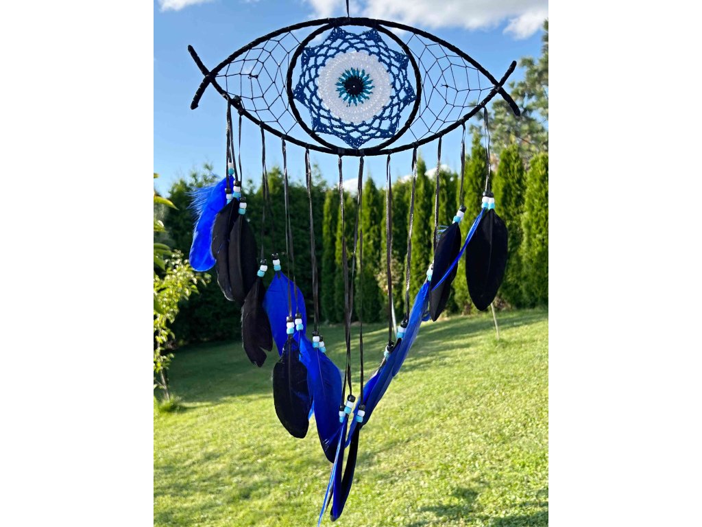 Tento jedinečný lapač snů ve tvaru oka je symbolem ochrany, moudrosti a intuice. Ručně háčkovaný střed v odstínech bílé, modré a tyrkysové připomíná legendární „ochranné oko“, které podle tradic odvrací negativní energie a přináší klidnou mysl.