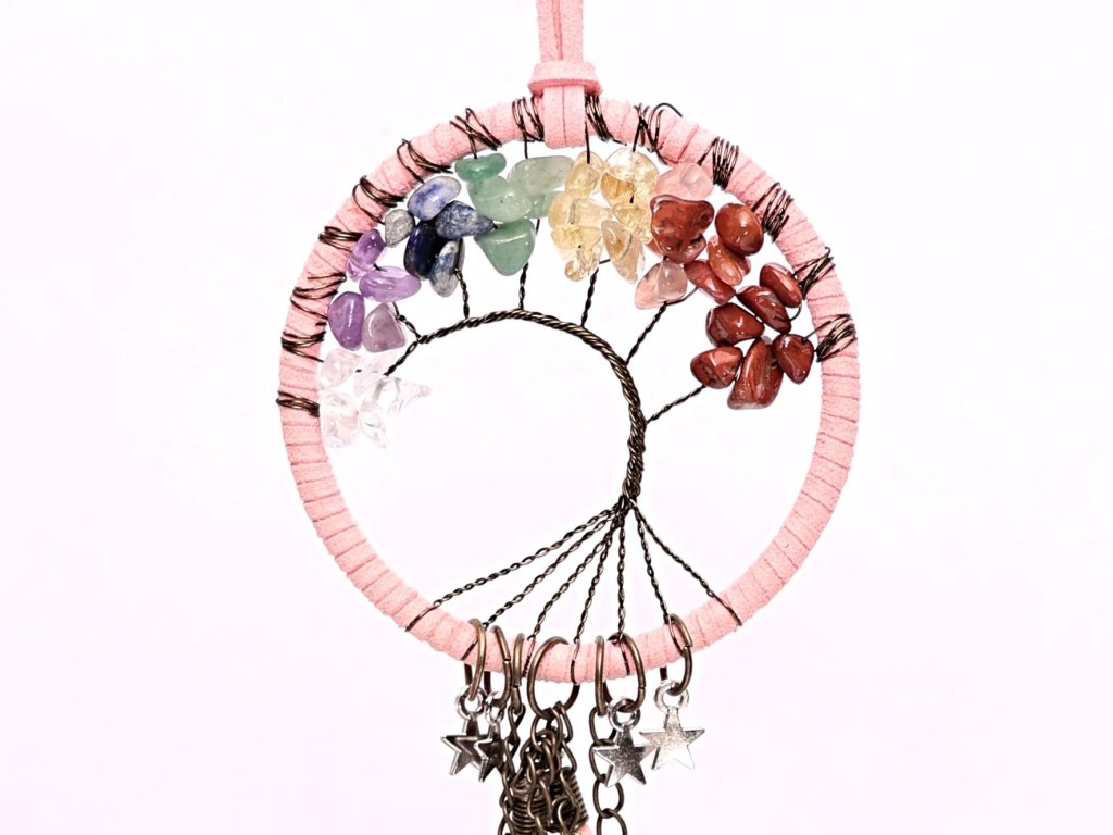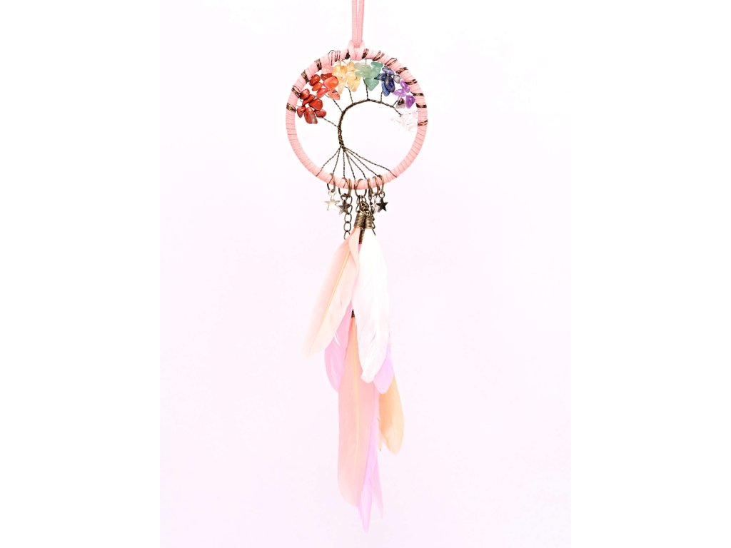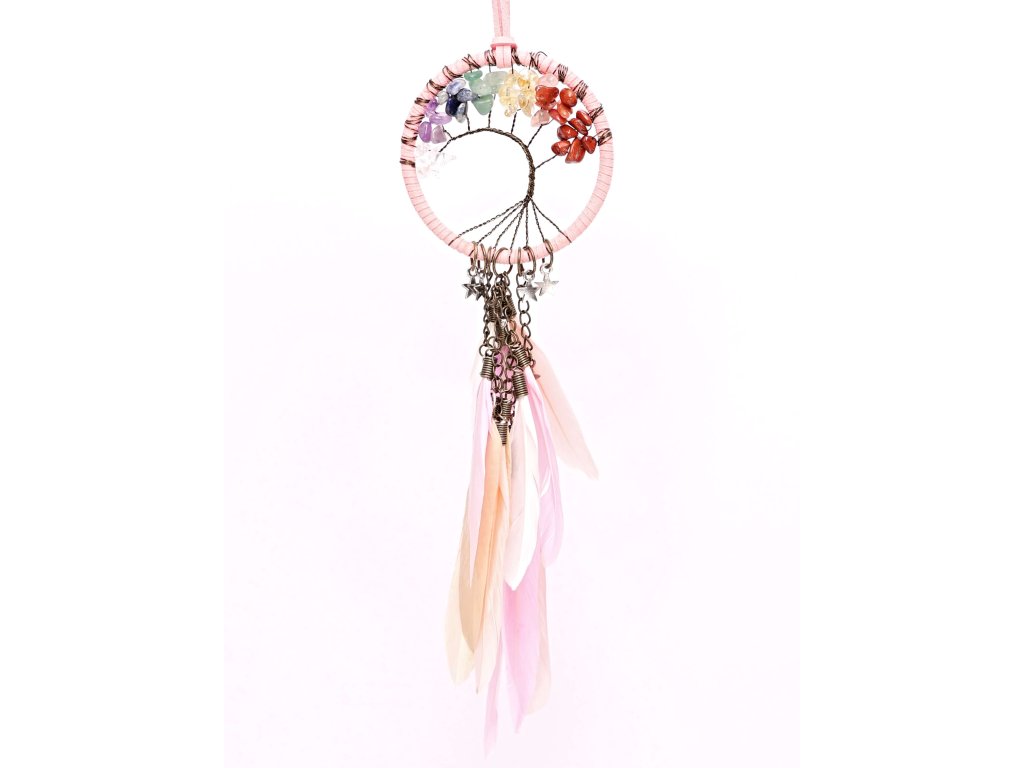 Okouzlující lapač snů s motivem stromu života, vyrobený s jemností a smyslem pro detail. Kruhový rám o průměru cca 8 cm je obtočen růžovým semišovým provázkem a vyplněn drátěným stromem, jehož korunu tvoří barevné minerální kamínky symbolizující čakry – od červené po fialovou. 🌈