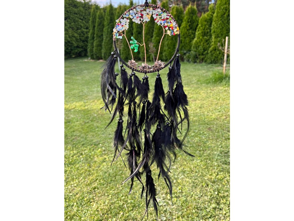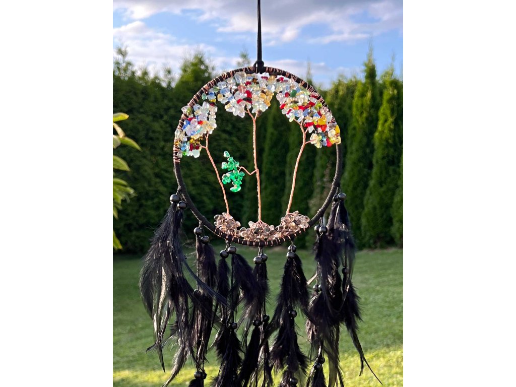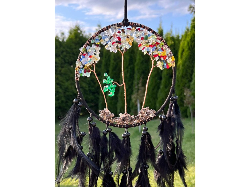 Lapač snů – Strom života v duze minerálů a černých pírkách #ZB398