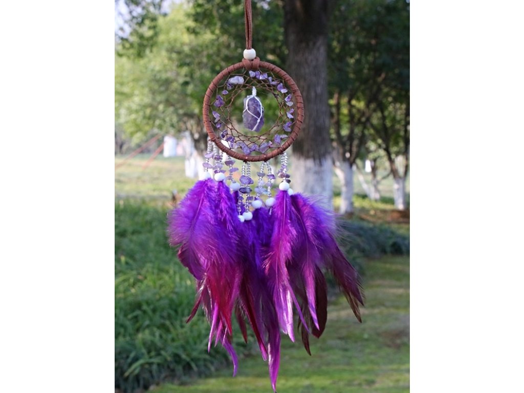🔹 Ze spodní části splývají prameny zdobené ametystem, bílými korálky a bohatým fialovým peřím. Peříčka se při pohybu vzduchu jemně vlní a vytvářejí uklidňující atmosféru.