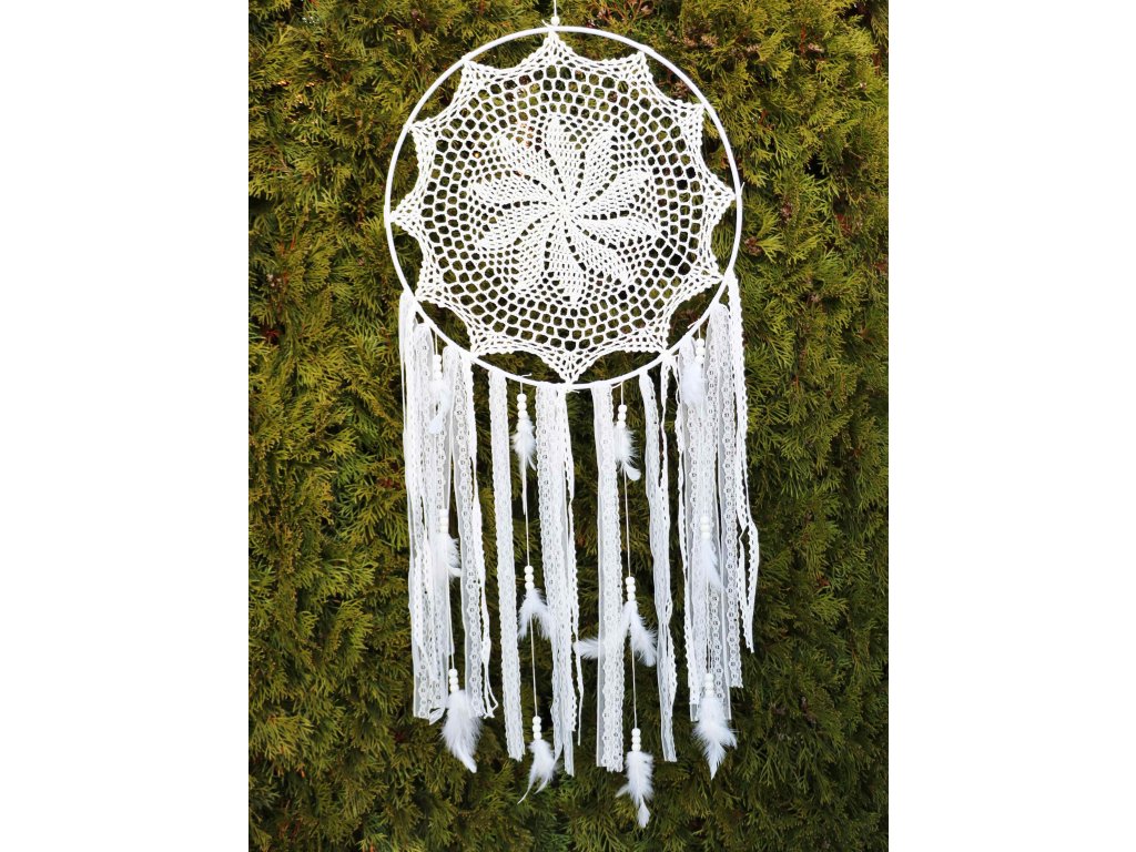 Ručně vyráběný bílý lapač snů s háčkovaným středem #ZB345 čistota, klid a jemná ochrana prostoru