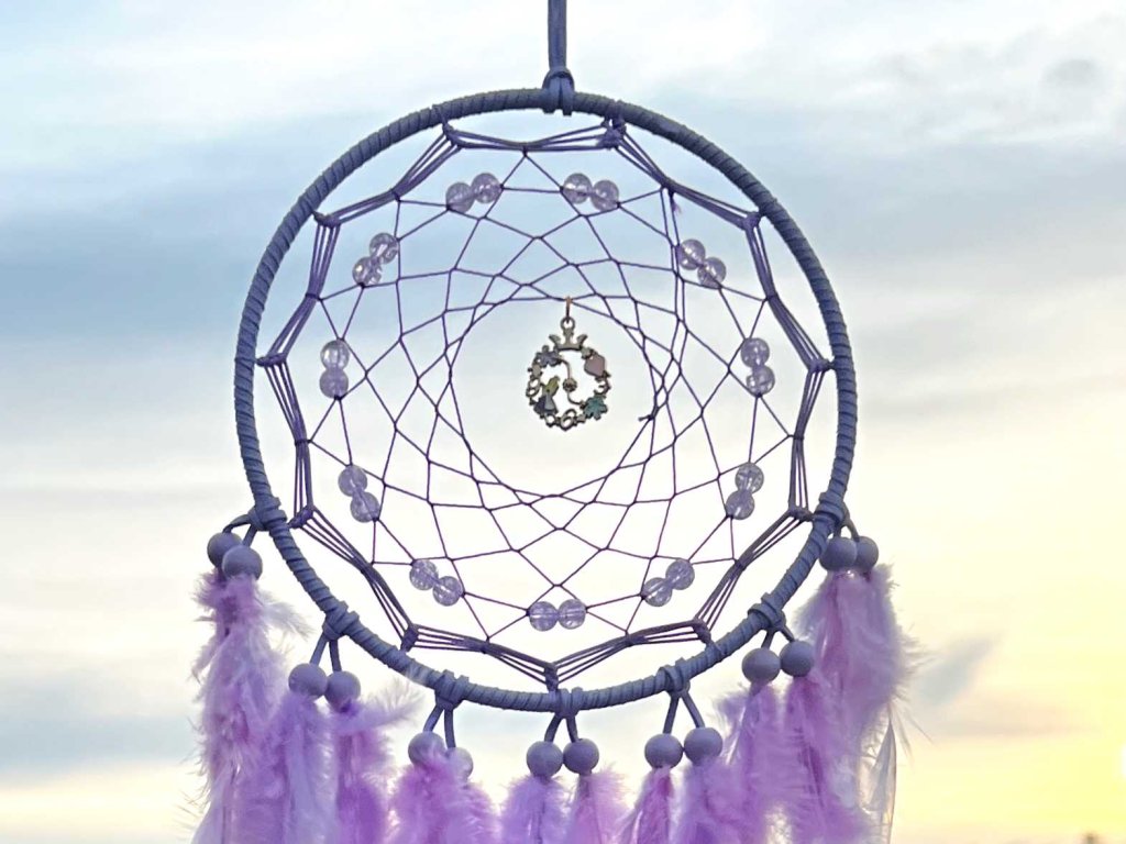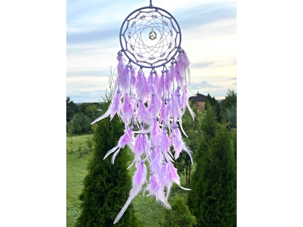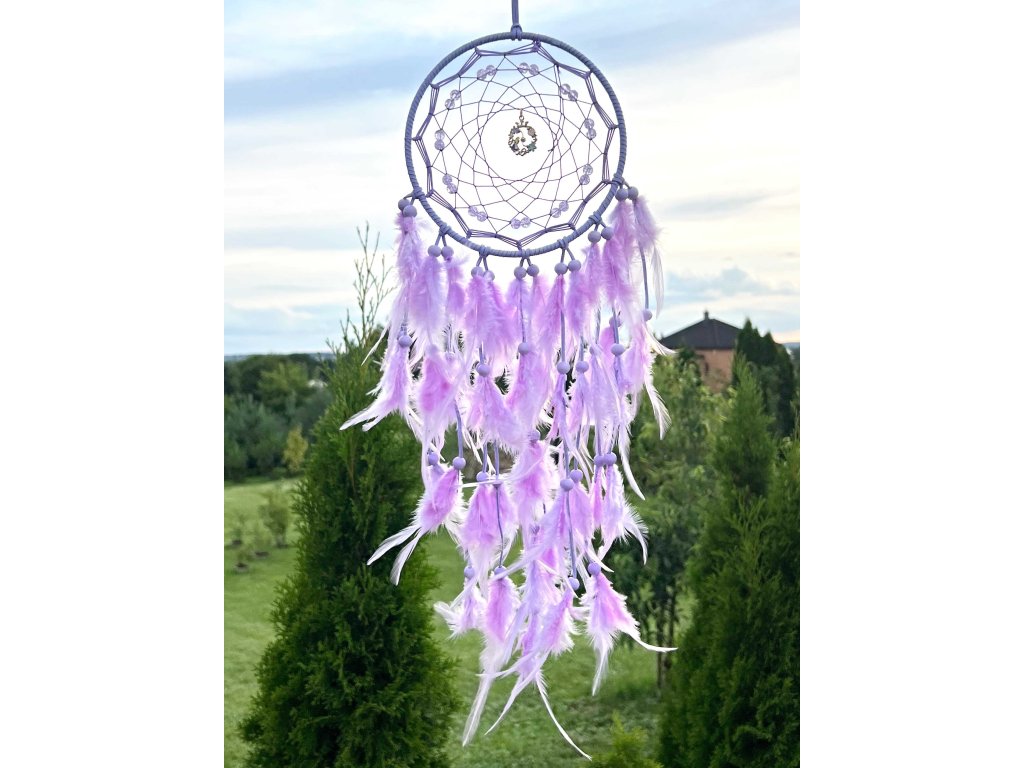 Tento jemný lapač snů v odstínech levandulové je ideální volbou pro ty, kdo hledají spojení s lehkostí a jemnou ženskou energií. Uprostřed síťky je zavěšený drobný kovový přívěsek ve tvaru stromu, zdobený malými pastelovými kamínky. Celý výtvor je doladěn průhlednými korálky a peříčky ve fialových tónech, které se krásně pohybují ve větru a vytvářejí klidnou atmosféru.