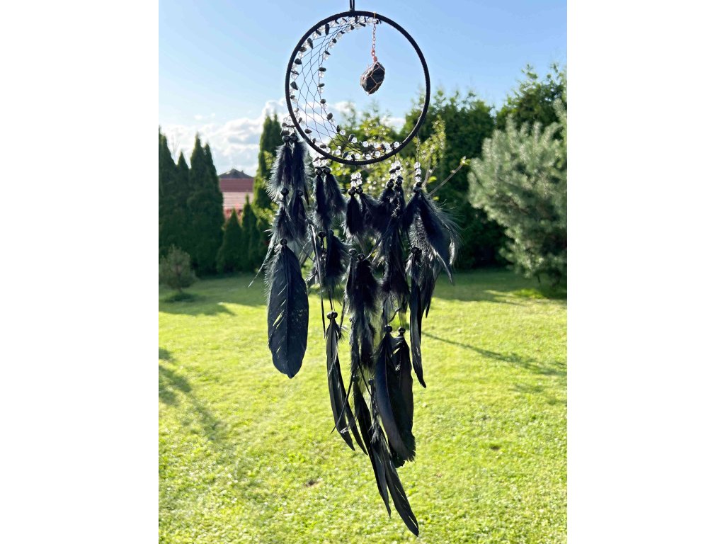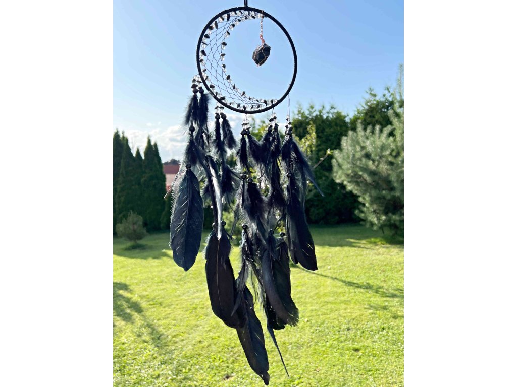 Černé pírka při každém závanů větru tiše šustí a dodávají lapači snů dramatický a elegantní nádech. Tento kousek je ideální nejen nad postel, ale také jako designová dekorace do obývacího pokoje, meditačního koutu či pracovny, kde vnese klid a tajemnou atmosféru. 🌙✨