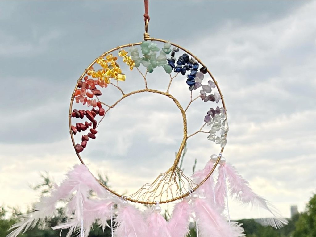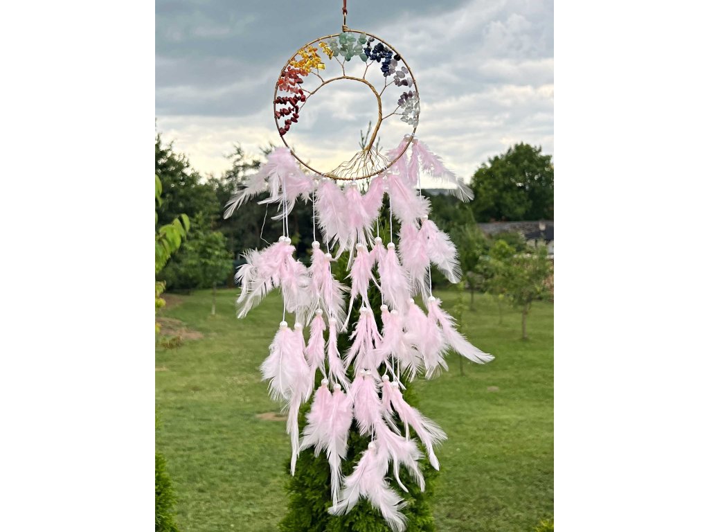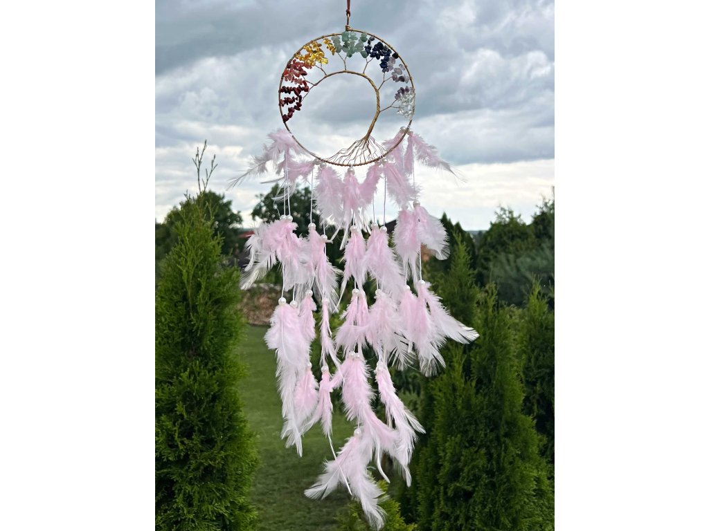 Tento výjimečný lapač snů v sobě spojuje sílu duhové energie čaker se symbolem stromu života, který je ručně tvořen z přírodních minerálů v barvách jednotlivých energetických center těla. Strom je zasazen do kruhu o průměru cca 16 cm, zatímco jemné světle růžové pírka doplňují celkovou délku na přibližně 60 cm.
