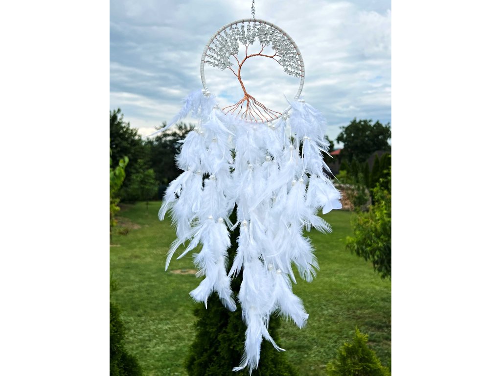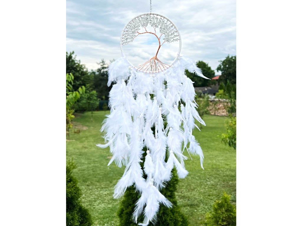 🤍 Lapač snů se stromem života – křišťál & bílé pírka (60 cm)