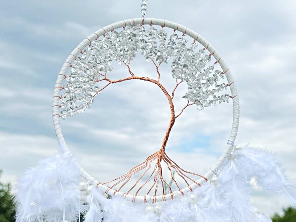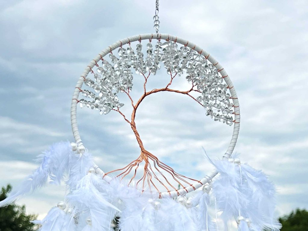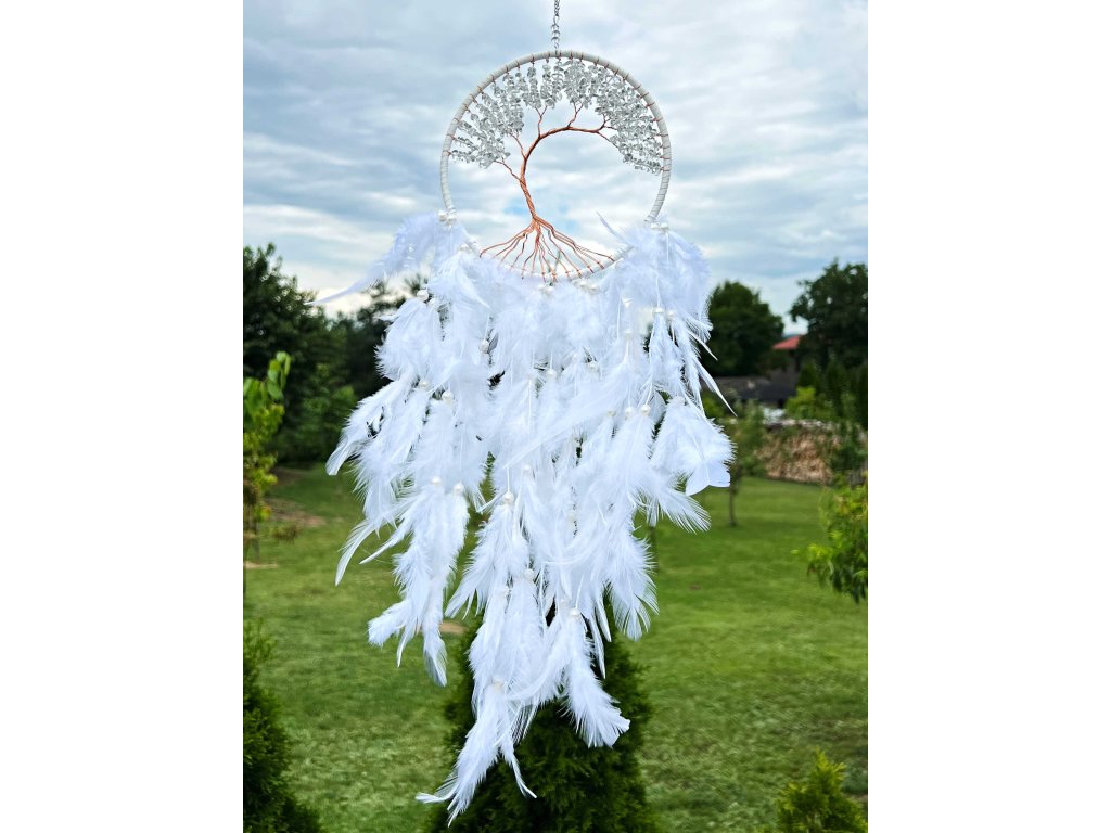 Elegantní a harmonický lapač snů s motivem stromu života je tvořen z přírodního křišťálu a měděného drátu, zasazeného do kruhu opleteného bílou nití. Koruna stromu je tvořena desítkami drobných krystalů křišťálu, které září čistotou a energií. Bohaté bílé pírka ve spodní části působí jemně a étericky, čímž tento kousek proměňuje prostor v místo klidu a světla.