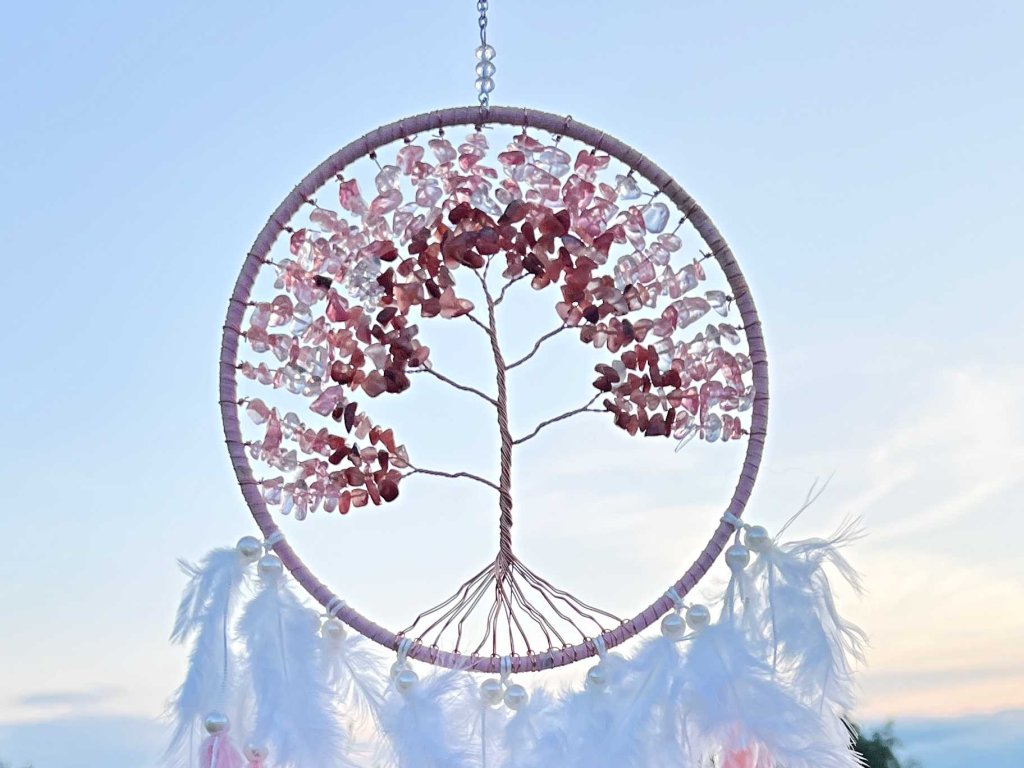 Romantický a jemně laděný lapač snů se symbolem stromu života, ručně tvořený z přírodních kamenů růženínu a červeného achátu. Strom je zasazen do kovového kruhu opleteného růžovým provázkem o průměru 16 cm a jeho větve se rozprostírají do korun z minerálů různých odstínů – od světle růžové až po teple červenou. Bohaté závěsy tvoří bílé a růžové pírka, které dodávají celku lehkost, něžnost a vzdušnost. Celková délka dekorace je cca 60 cm.