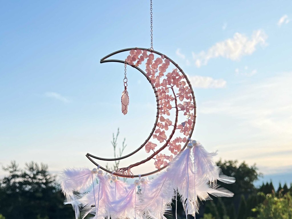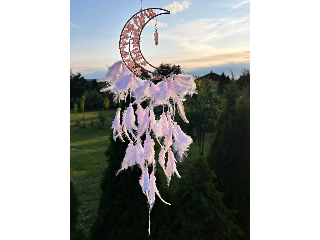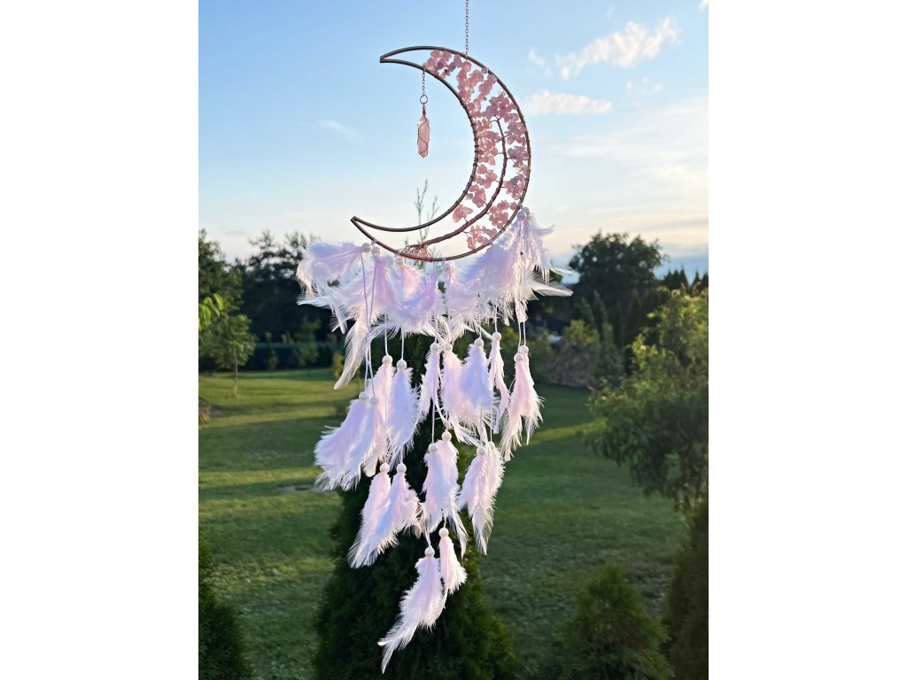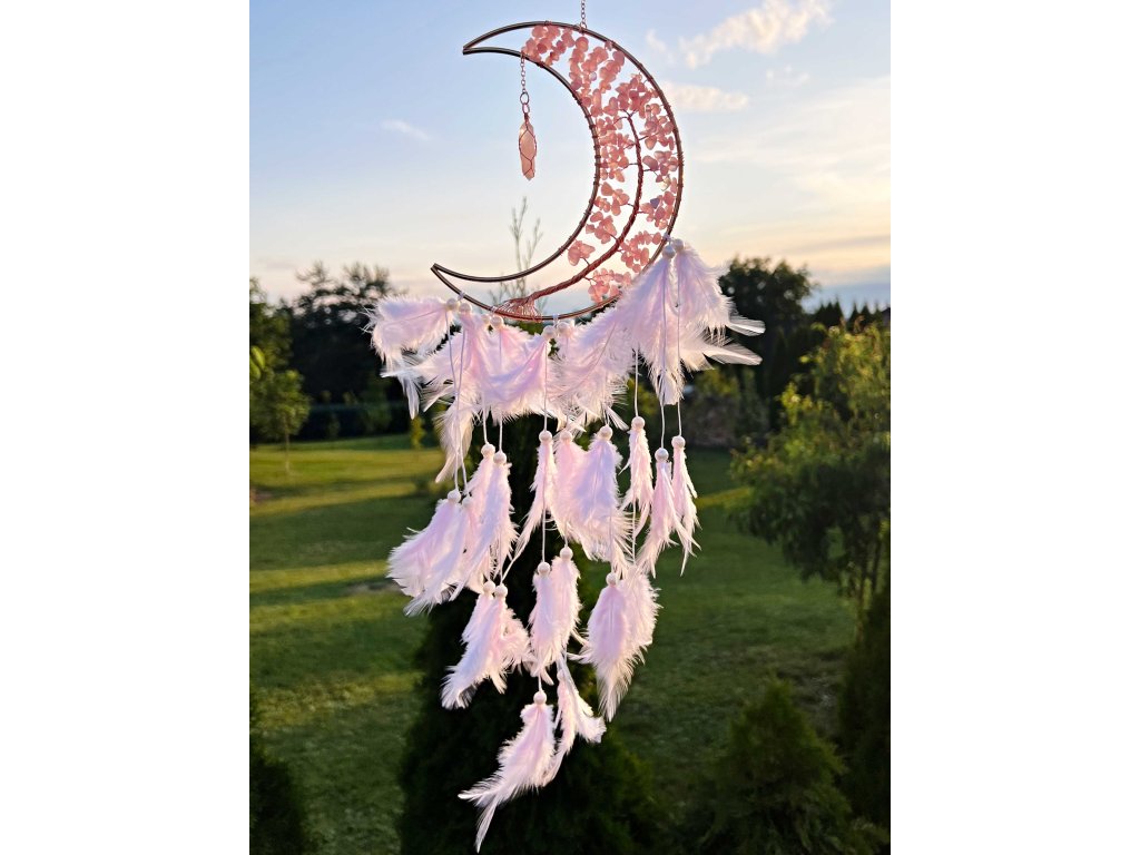 Romantický a něžně laděný lapač snů ve tvaru půlměsíce, vyplněný přírodními kamínky růženínu – kamenem lásky, klidu a harmonie. Jemně růžové odstíny minerálů krásně ladí s kovovou konstrukcí a vytvářejí dojem jemné lunární energie. Měsíc je zdoben také zavěšeným růženínovým krystalem v měděné síti, který ještě zesiluje působení celku.