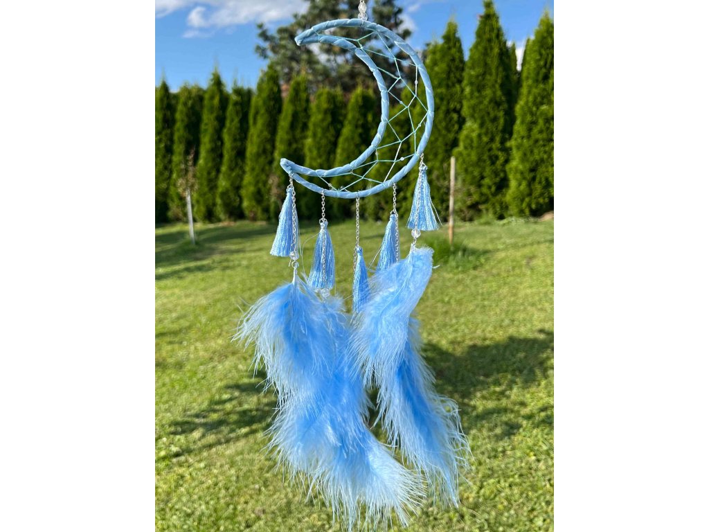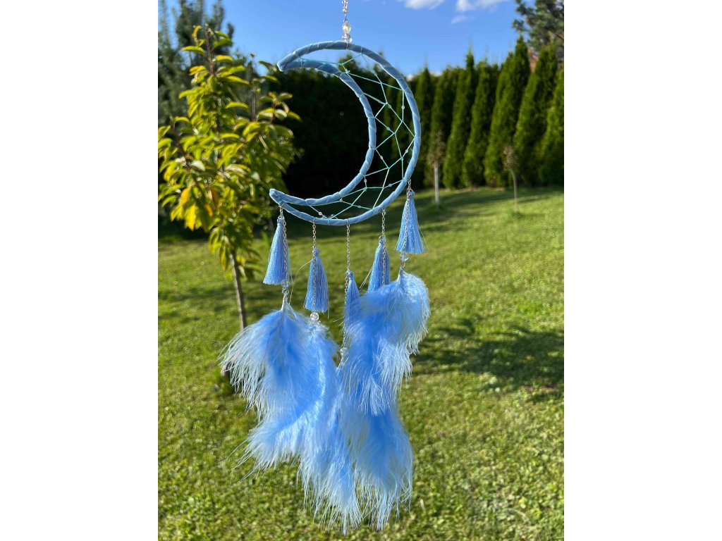 Elegantní lapač snů v podobě půlměsíce, vyrobený v jemně modré barvě, který působí uklidňujícím a harmonickým dojmem.