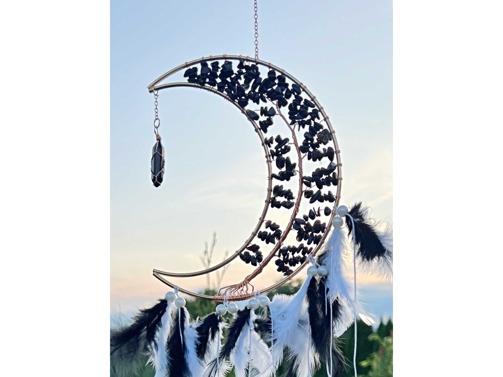 Magický a elegantní lapač snů ve tvaru půlměsíce, vyplněný přírodními kamínky černého obsidiánu, známého jako silný ochranný kámen. Ručně tvořená struktura měsíce o velikosti 16 cm je doplněna bohatým závěsem z černých a bílých peříček, které vytvářejí dojem noční oblohy plné klidu a harmonie.