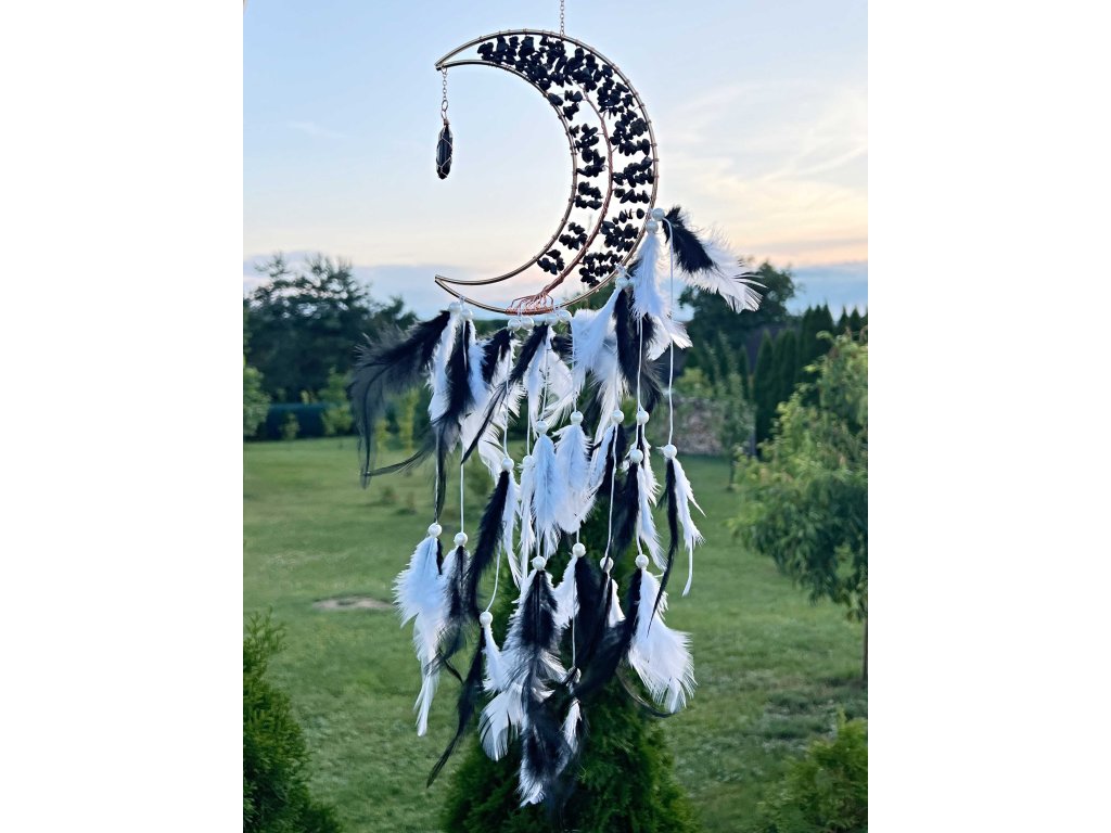 🌙 Lapač snů ve tvaru měsíce s obsidiánem – černobílá pírka (60 cm)
