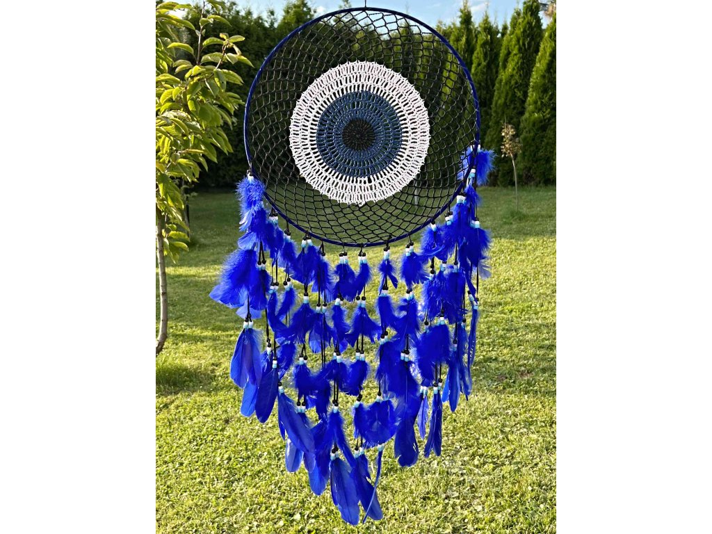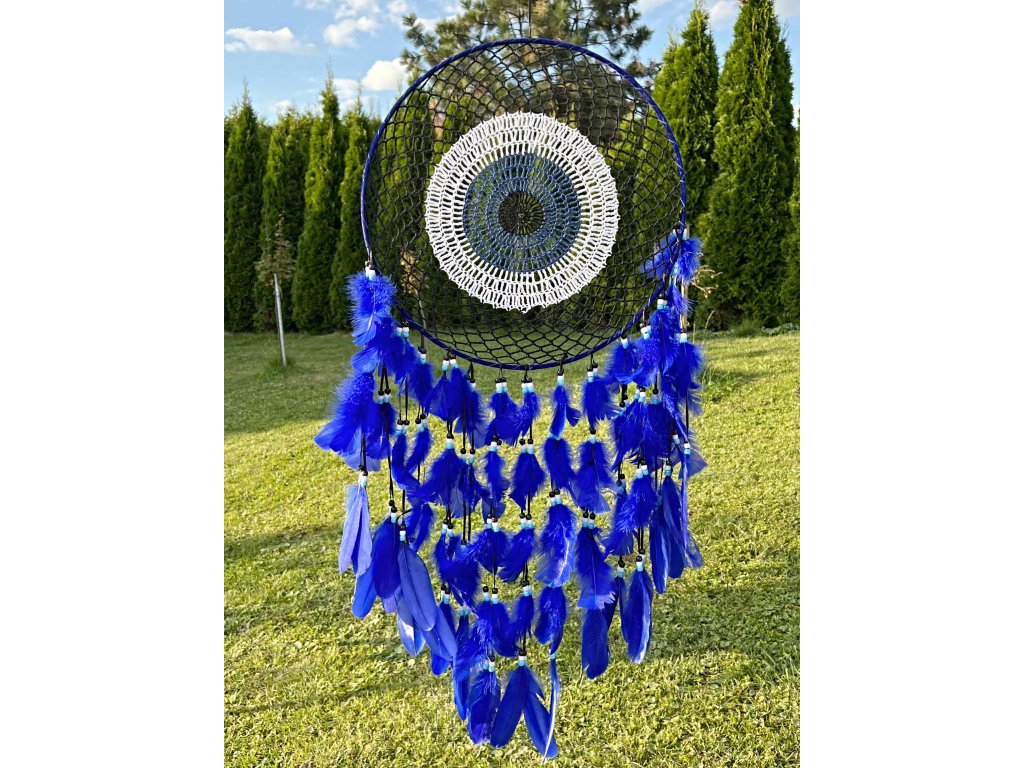 Elegantní a výrazný lapač snů, který zaujme svou barevnou kombinací a velkolepým provedením. Kruh o průměru 40 cm zdobí ručně háčkovaný střed v odstínech černé, tmavě modré a bílé, tvořící mandalový vzor, který připomíná symbol ochranného oka. Síťka kolem středu je spletena z černé šňůry a dodává lapači jemný kontrast.