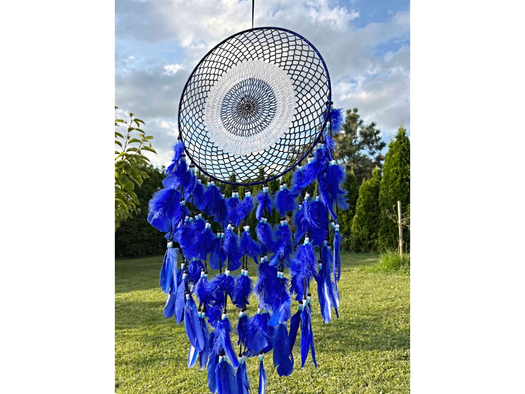 Po obvodu kruhu splývá množství zářivě modrých pírek v různých délkách, zavěšených na černých provázcích a doplněných korálky v bílé a tyrkysové barvě. Pírka se při pohybu lehce vlní a vytváří pocit klidu a volnosti. Celková délka lapače je 90 cm, což z něj činí působivý dekorační prvek, ideální pro zavěšení nad postel, do obývacího pokoje nebo meditačního koutku.