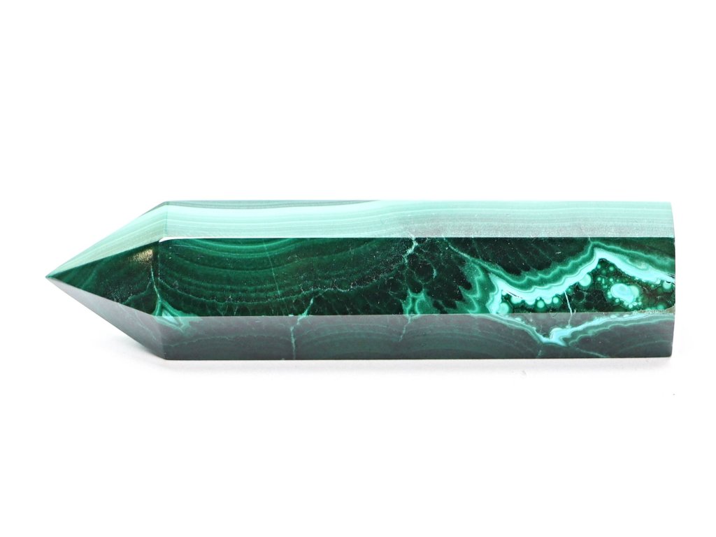 Tento nádherný malachitový obelisk je skvělým doplňkem pro sběratele minerálů i milovníky ezoteriky. Malachit je známý svými hypnotizujícími vzory v různých odstínech zelené a je spojován s ochranou, transformací a rovnováhou.